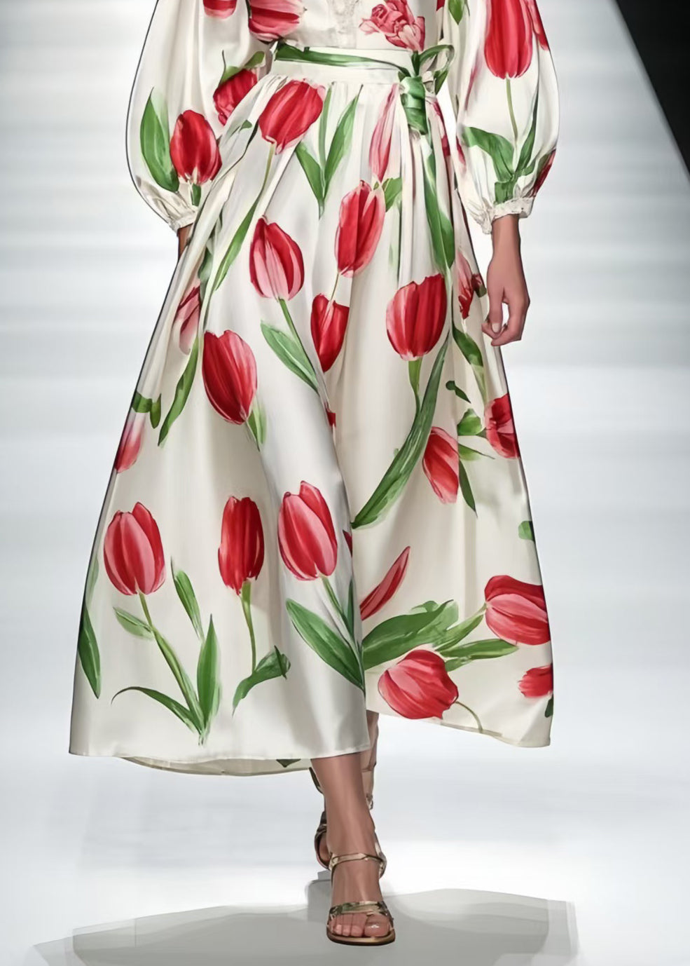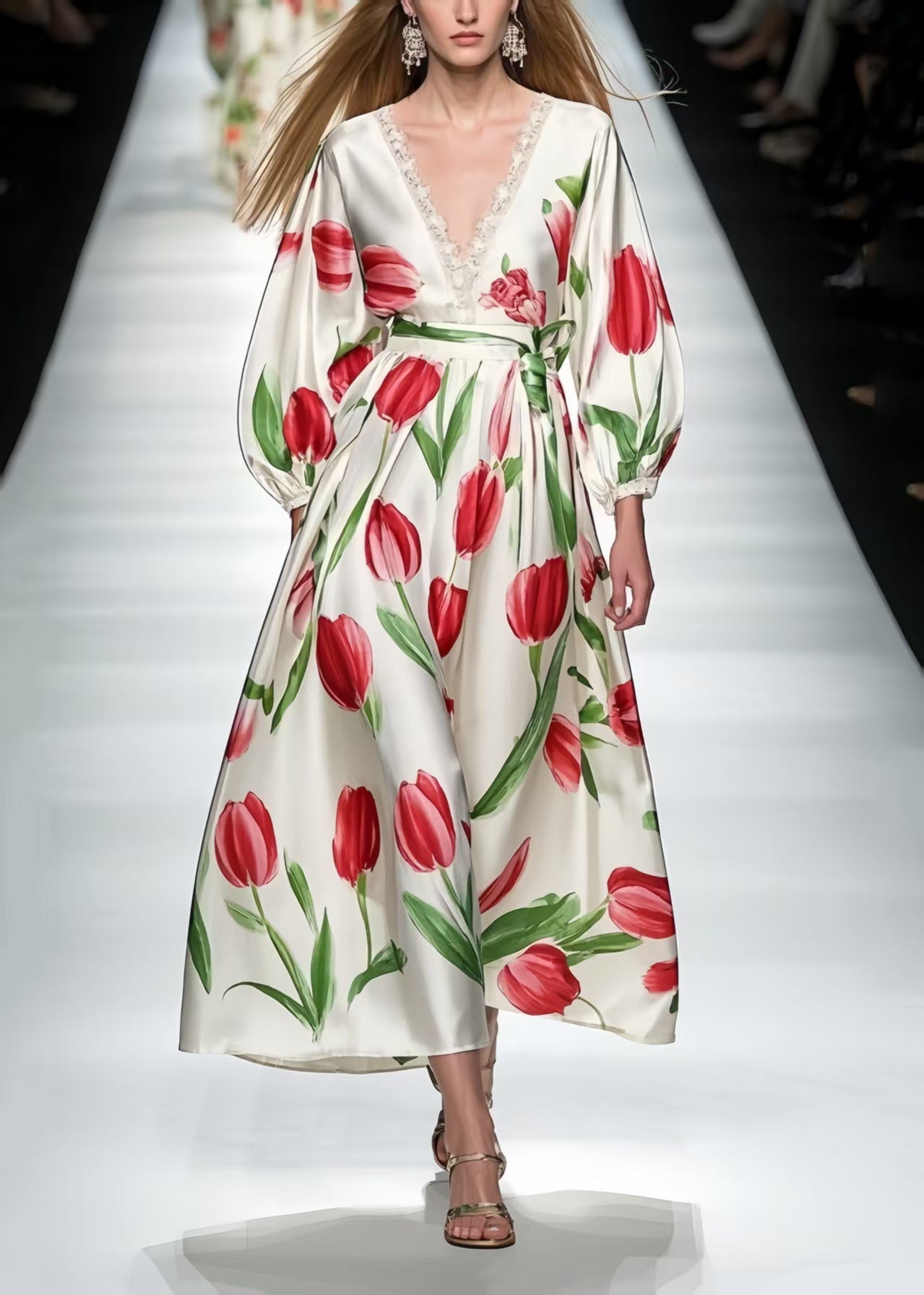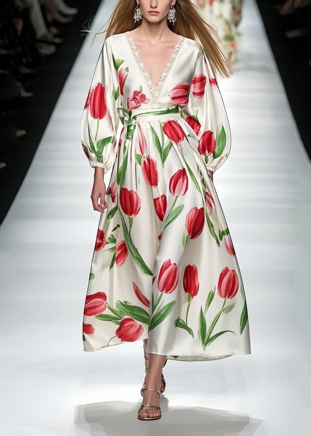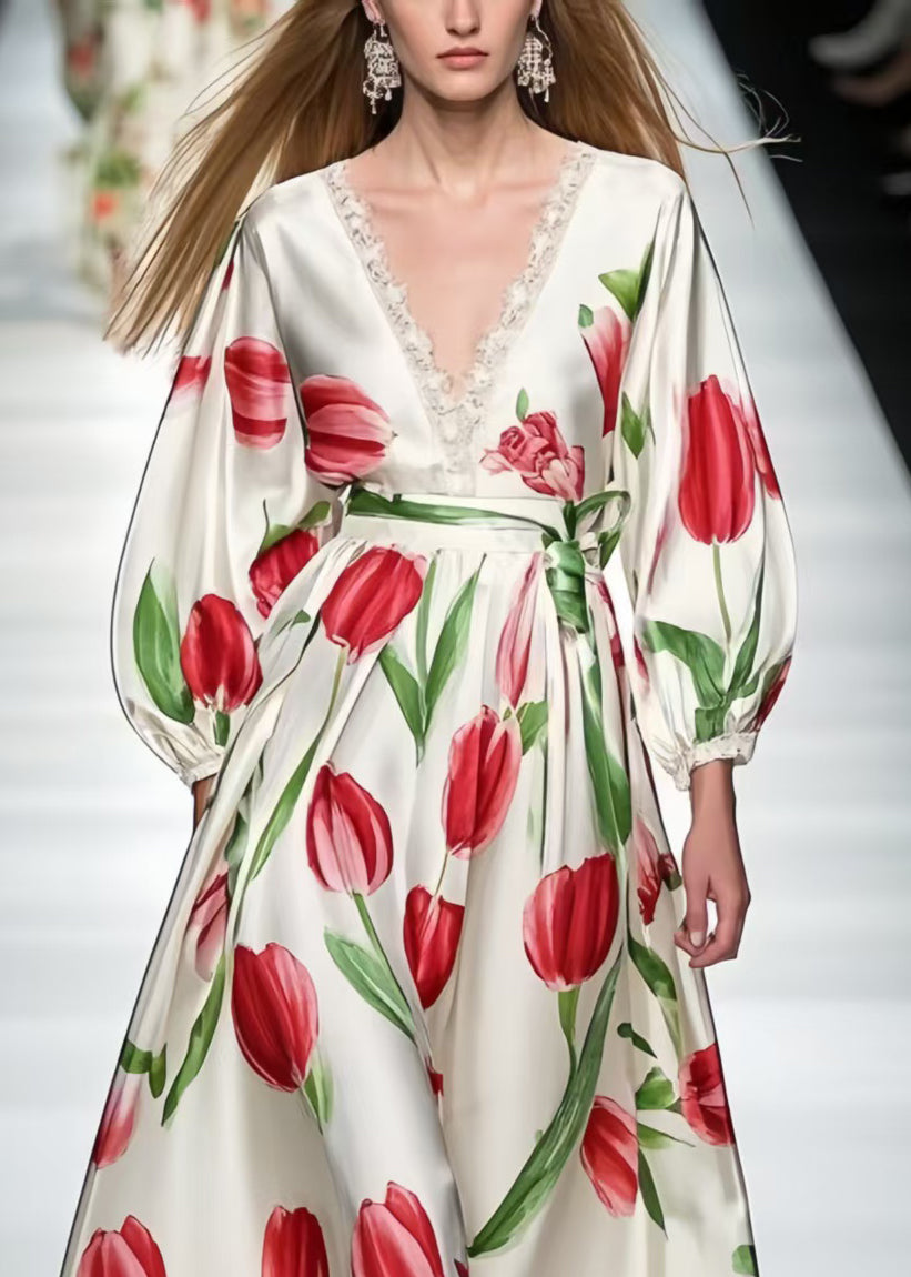 Red Floral Print Silk Ankle Dress V Neck Bracelet Sleeve