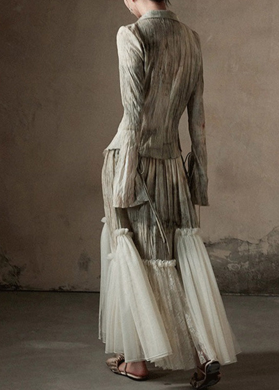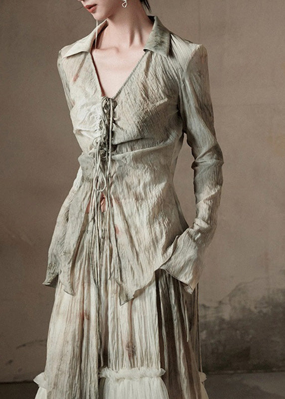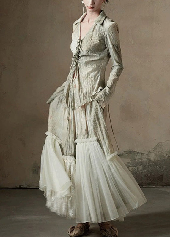 Retro Light Green Peter Pan Collar Tulle Patchwork Shirt And Maxi Skirts Two Piece Set Flare Sleeve
