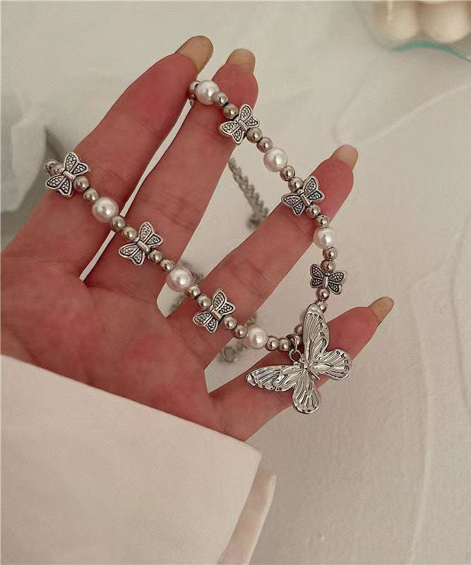Retro Silk Stainless Steel Pearl Butterfly Pendant Necklace