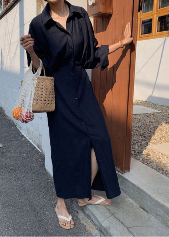 Einfaches schwarzes Peter-Pan-Kragen-Schnür-Taille-Baumwoll-langes Kleid Frühling