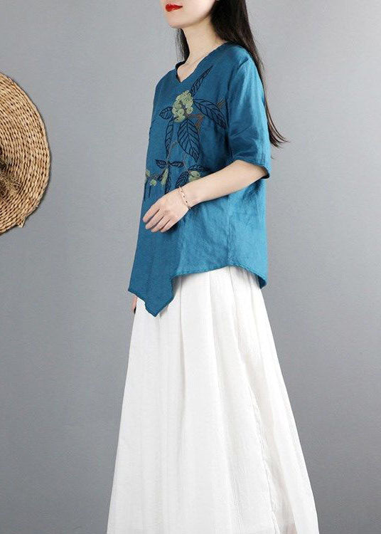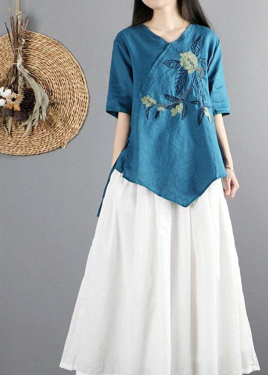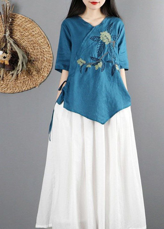 Einfaches blaues asymmetrisches Baumwolltop mit Bindegürtel und halben Ärmeln