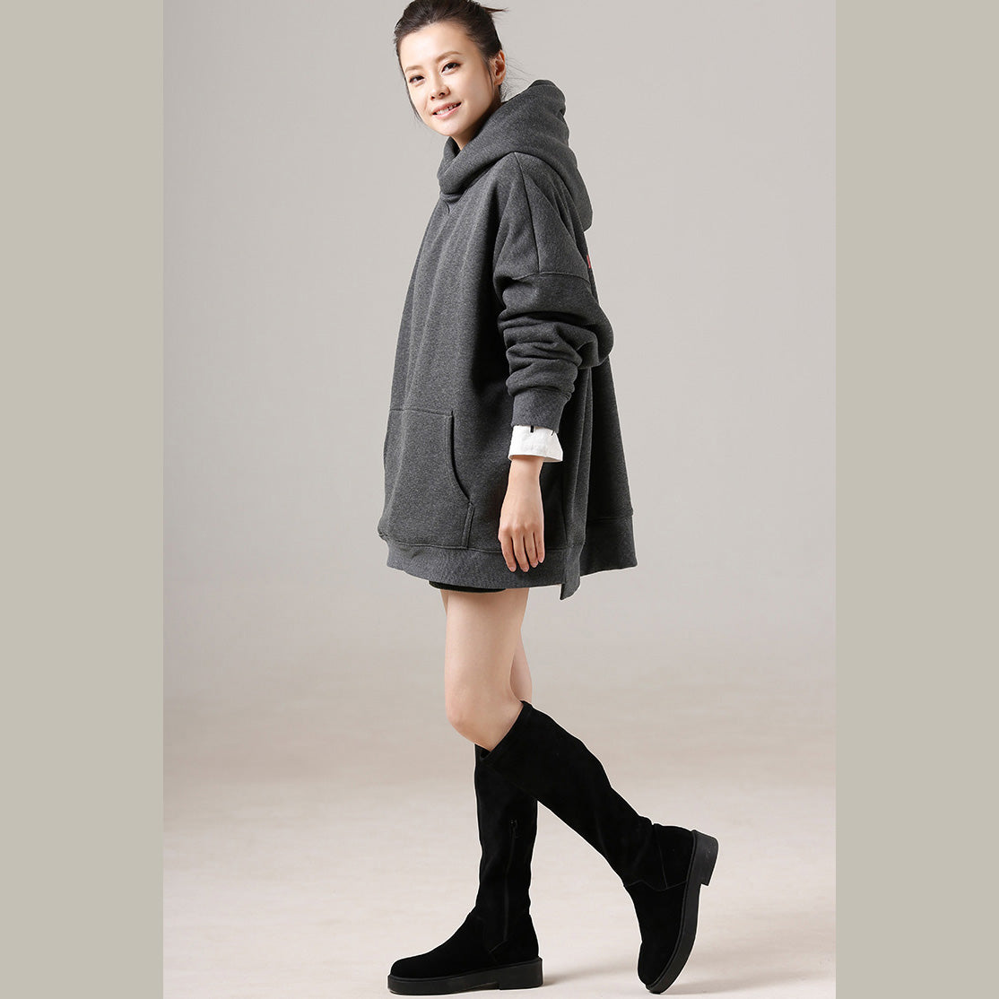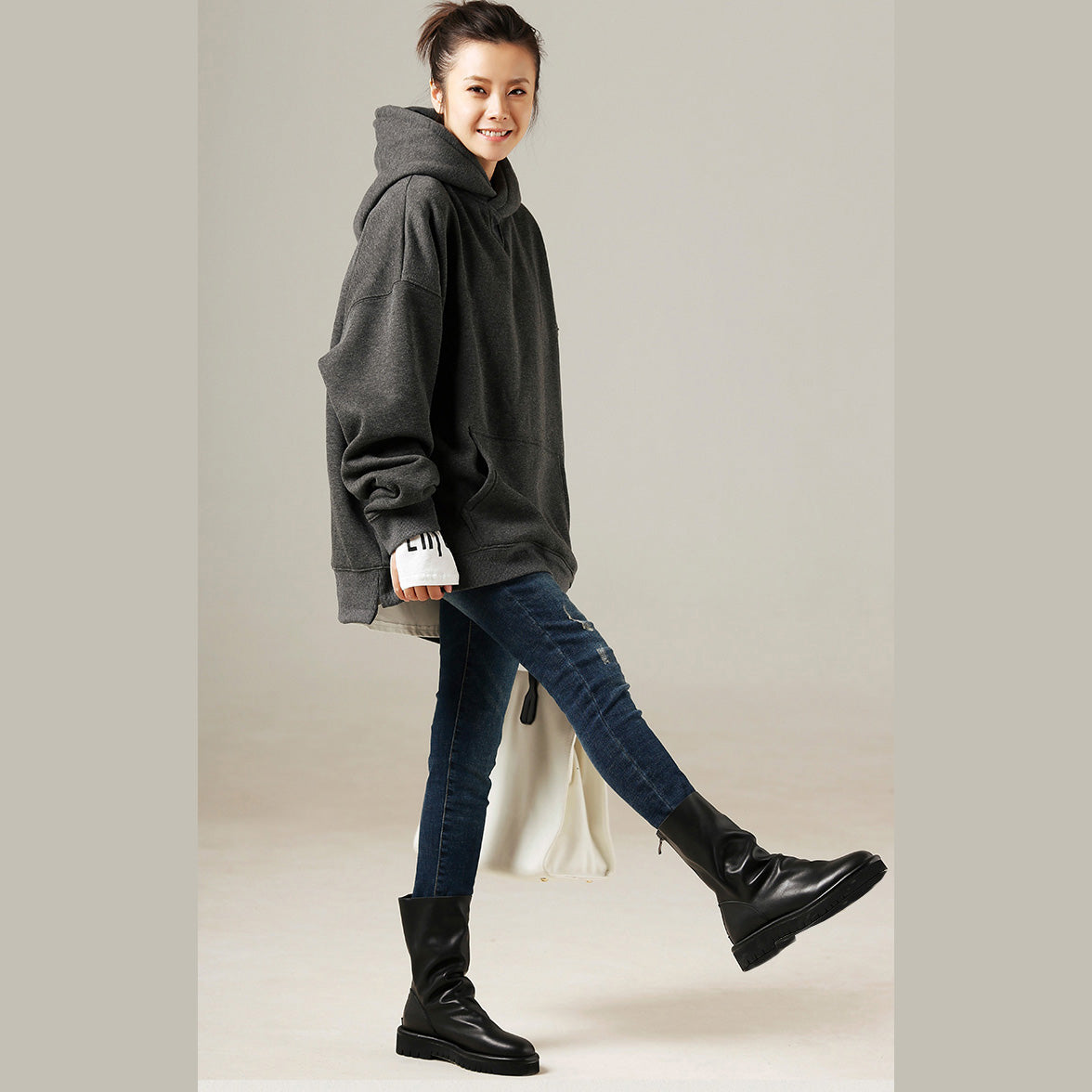 Einfache Baumwollbluse stylische große Taschen Outfits graue Silhouette Top mit Kapuze