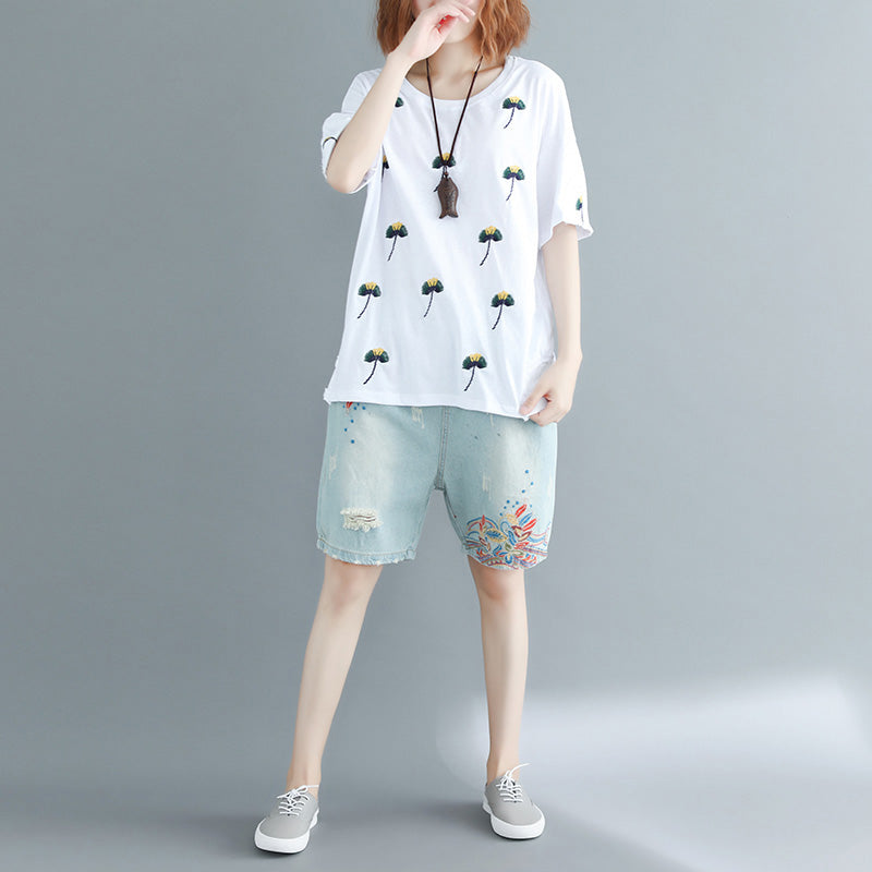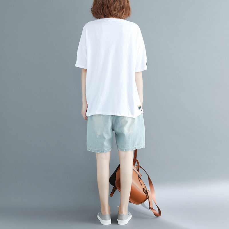 Einfache weiße Stickerei Baumwollkleidung Vintage Inspiration O-Ausschnitt loses Hemd