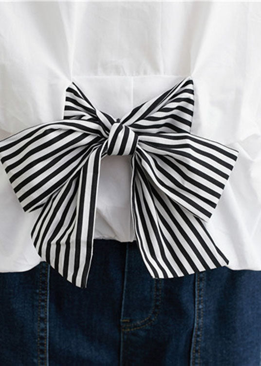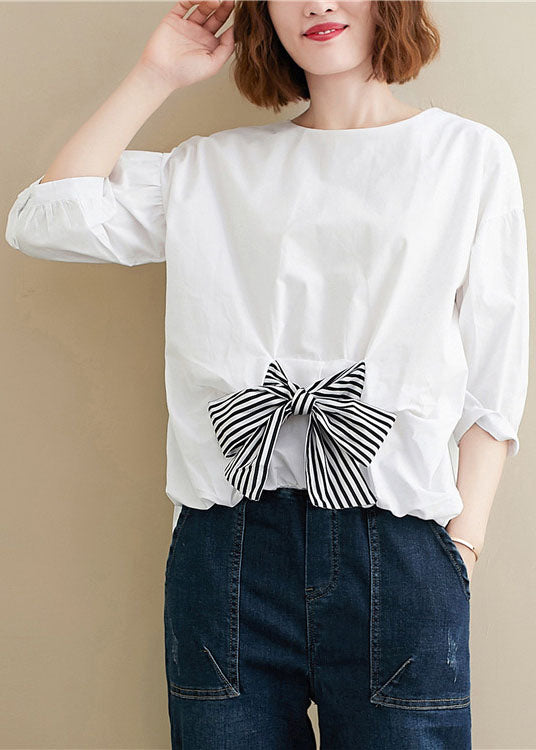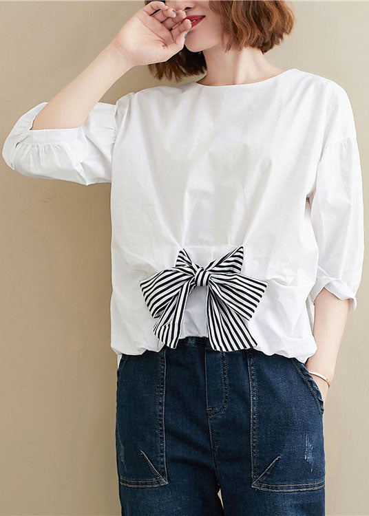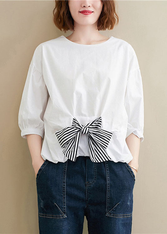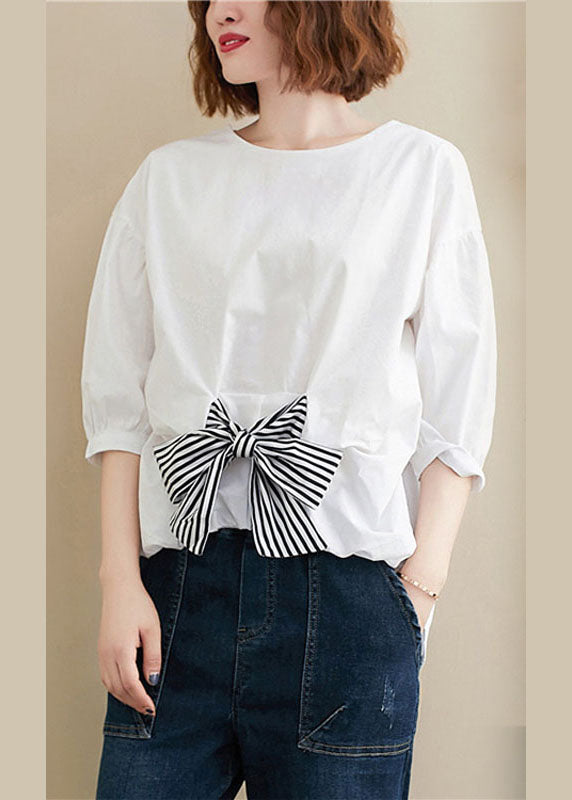 Einfaches weißes Patchwork-Oberteil mit Rundhalsausschnitt und Schleife und Dreiviertelärmeln