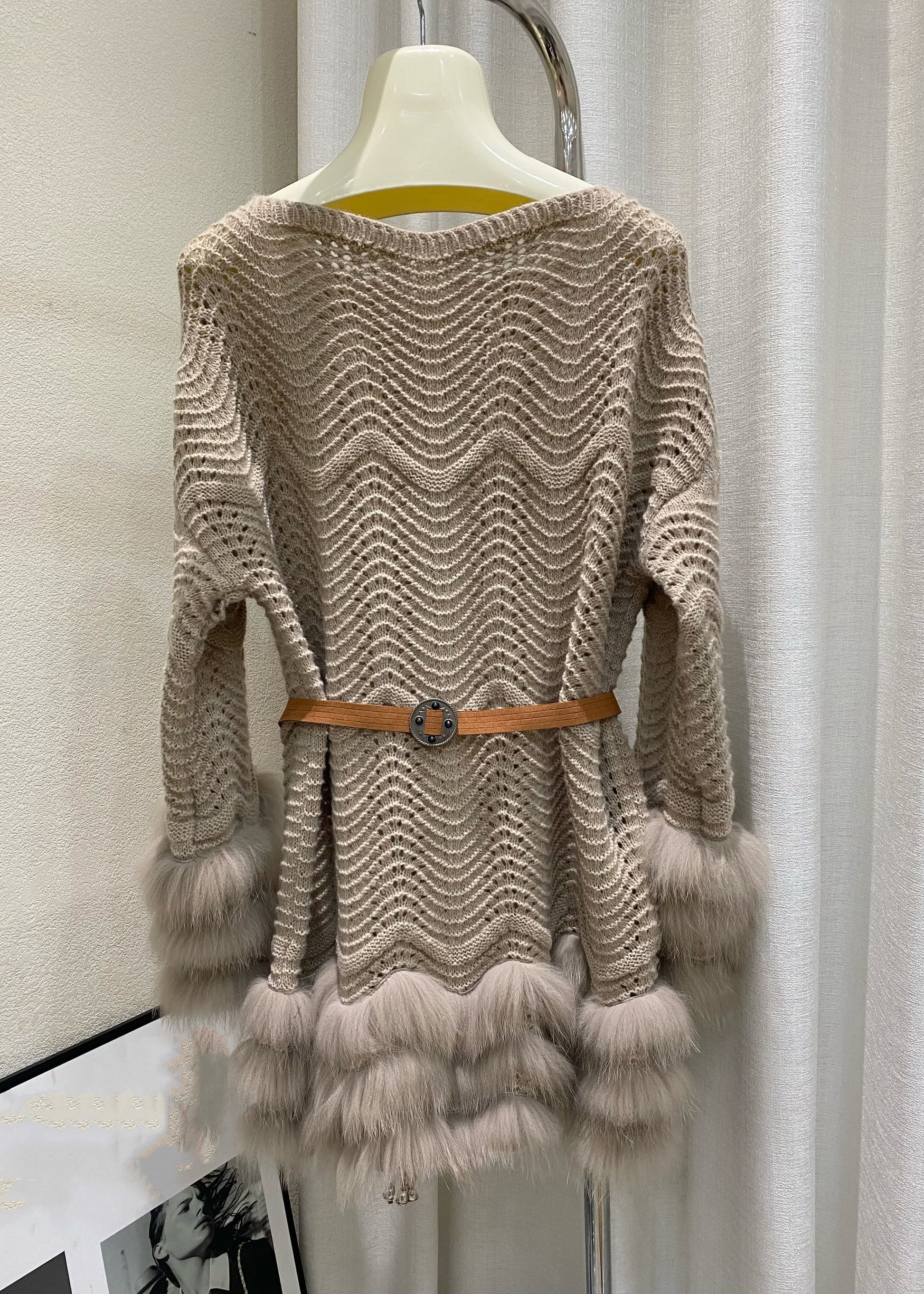 Slim Fit Beige Fox Patchwork Tie Waist Cotton Knit Sweaters Winter