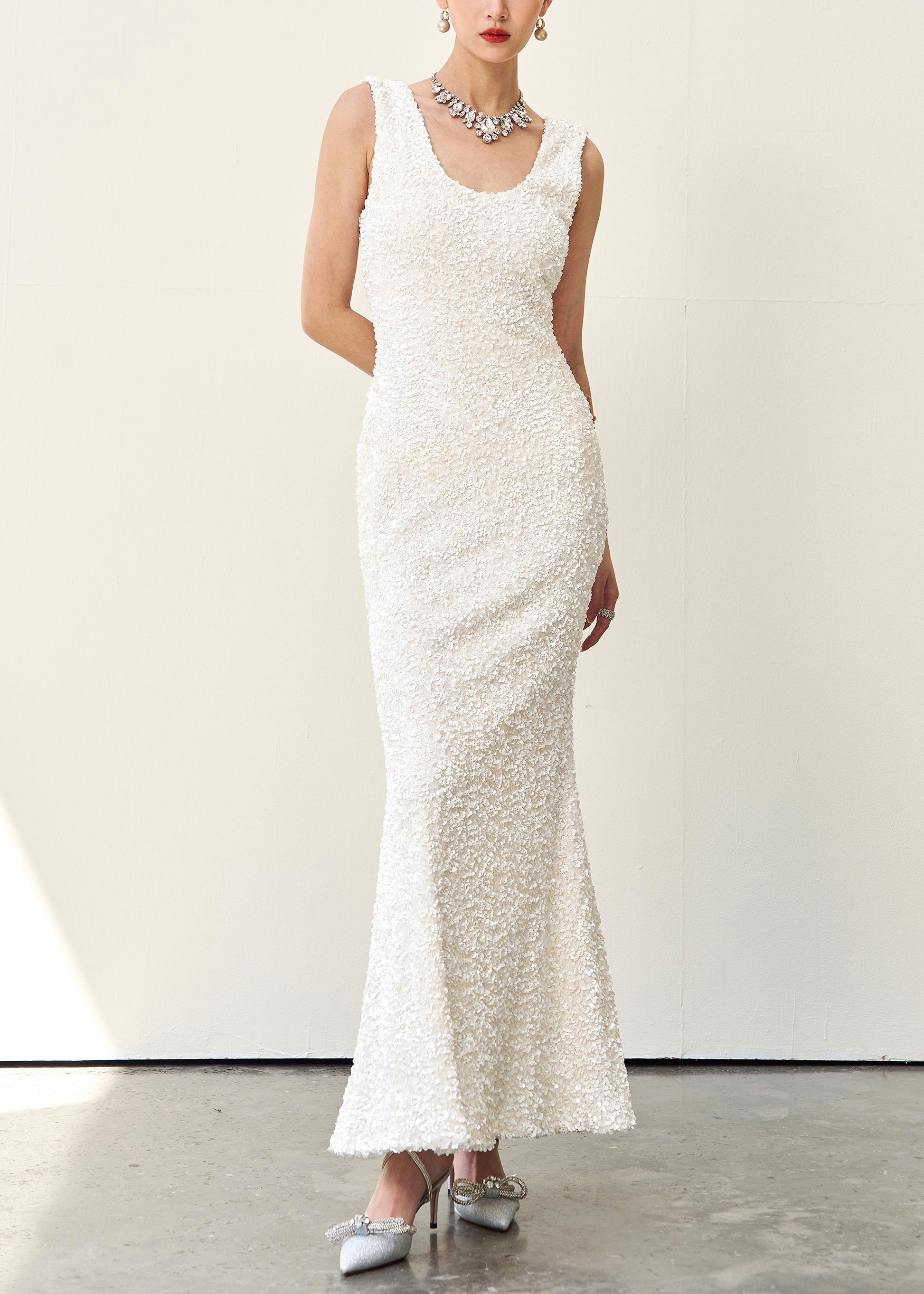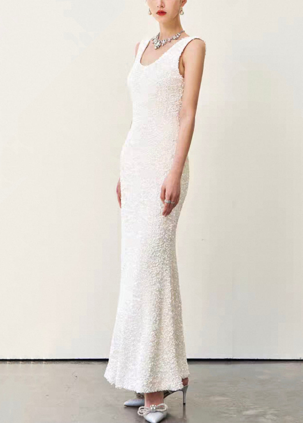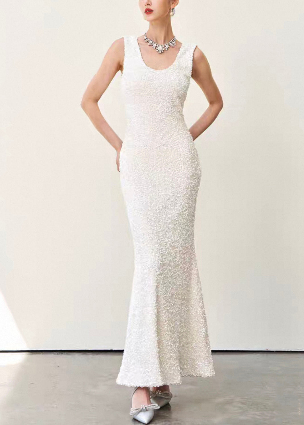 Slim Fit Beige U Neck High Waist Cotton Long Dresses Sleeveless