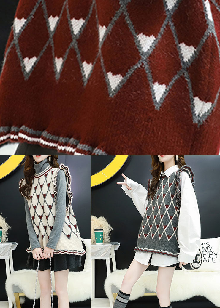Style Beige O-Ausschnitt Rüschen Plaid Herbst Strickweste