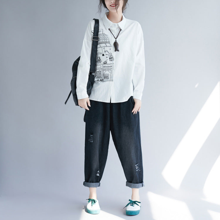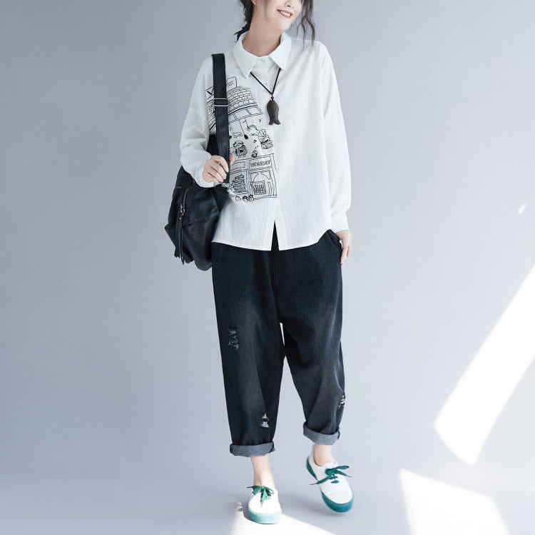 Stil Reverskragen Baumwolle Tunika Top Fashion Fabrics weiß Drucke Tunika Blusen Frühling
