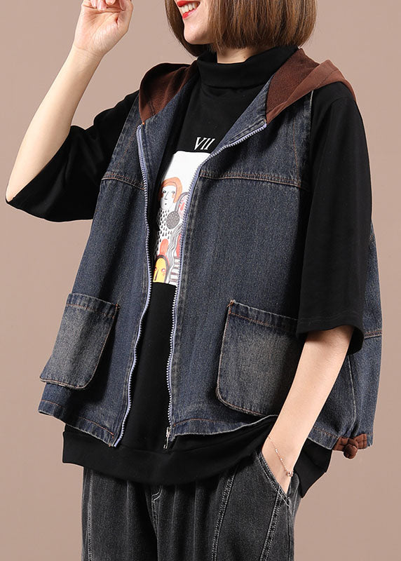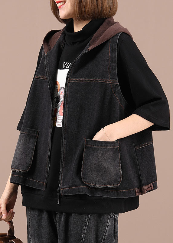 Stilvolle schwarze Herbstweste mit Kapuze und Patchworktaschen