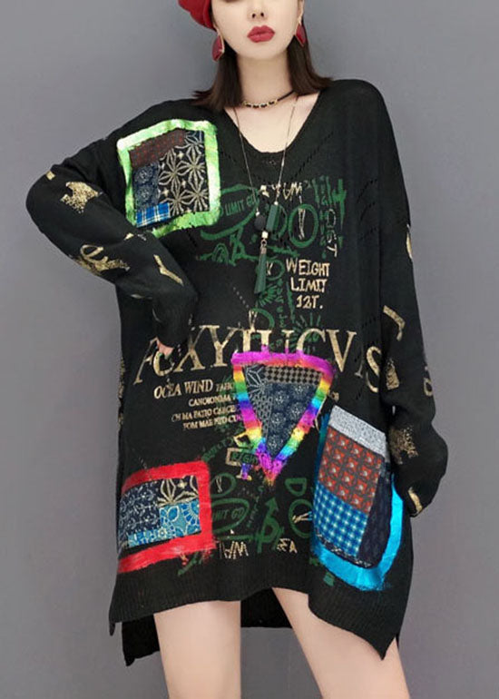 Stilvolle schwarze Strickkleider mit niedrigem und hohem Design, seitlich offen, V-Ausschnitt, Print, Frühling