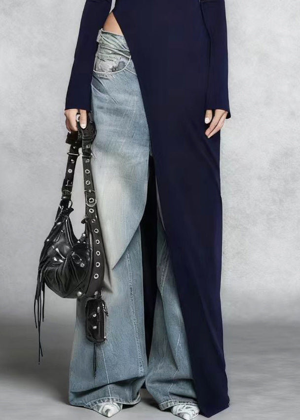 Stylish Navy Side Open Silm Fit Cotton Long Dress Spring