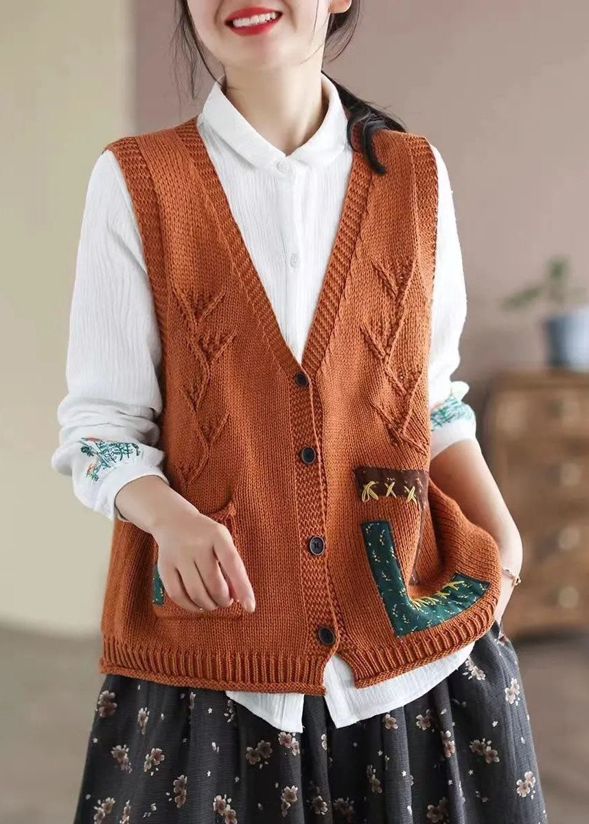 Stilvolle Orange V-Ausschnitt Taschen Patchwork Strickweste Frühling