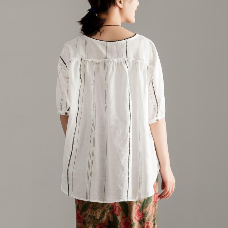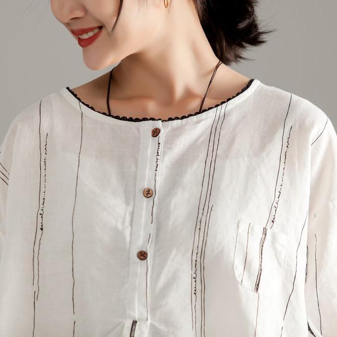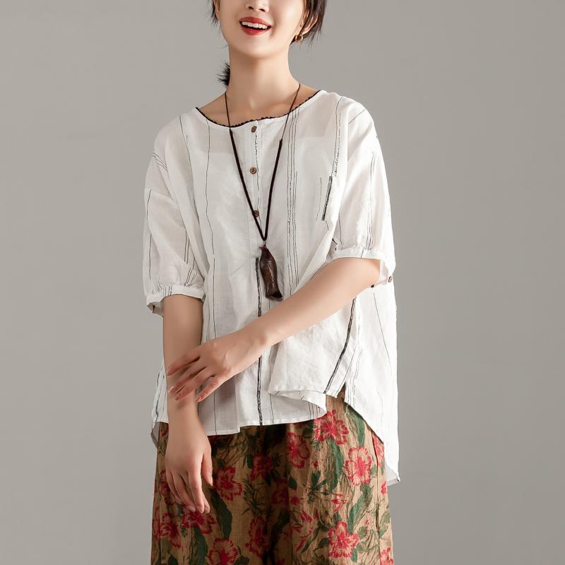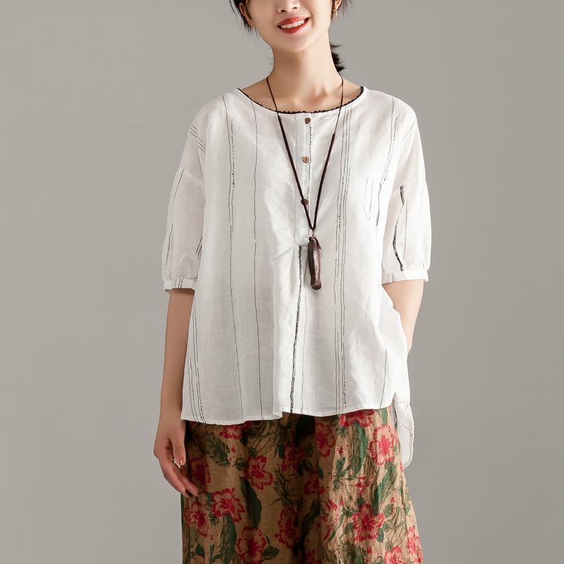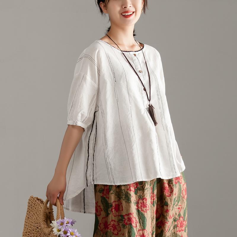 stylische Oberteile aus reinem Leinen in Übergröße, Rundhalsausschnitt, Halbarm, Streifen-Pulloverbluse