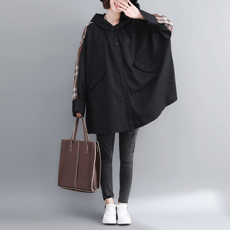 feiner schwarzer Baumwollmantel für Damen in Übergröße mit Kapuze, mittellange Jacken, Patchworkjacke
