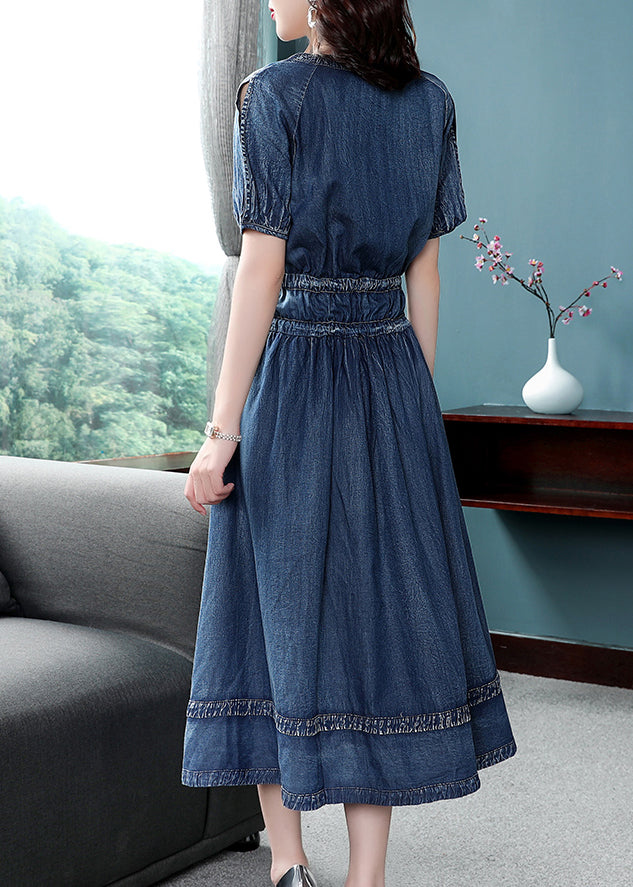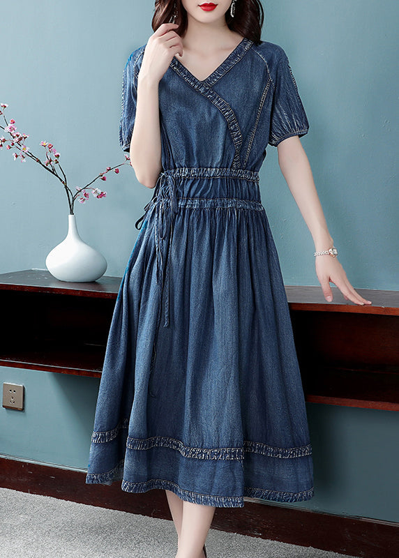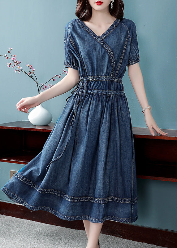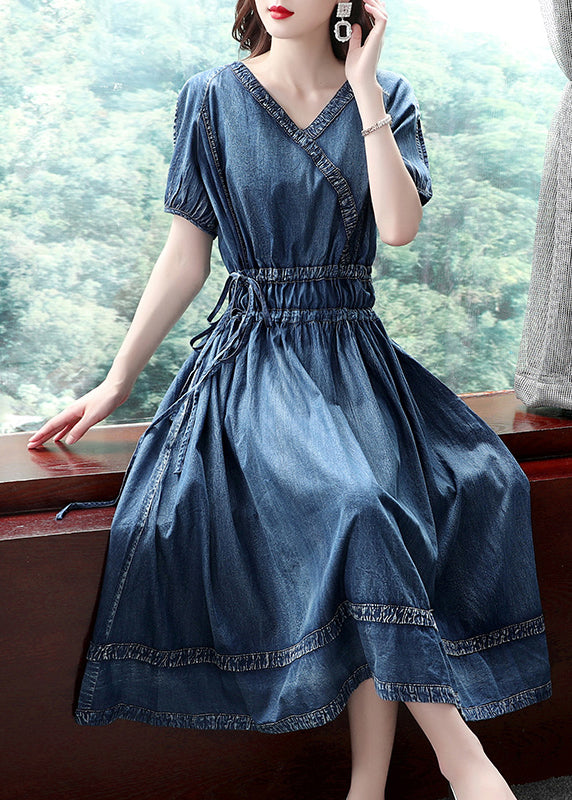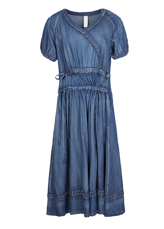 2022 Blaues, gerafftes Baumwoll-Jeanskleid mit V-Ausschnitt und kurzen Ärmeln