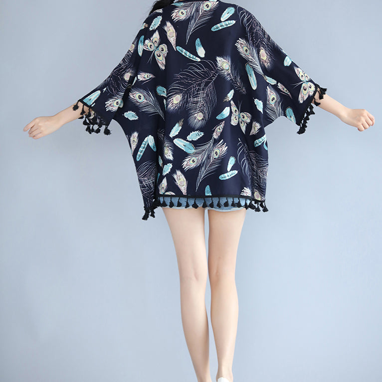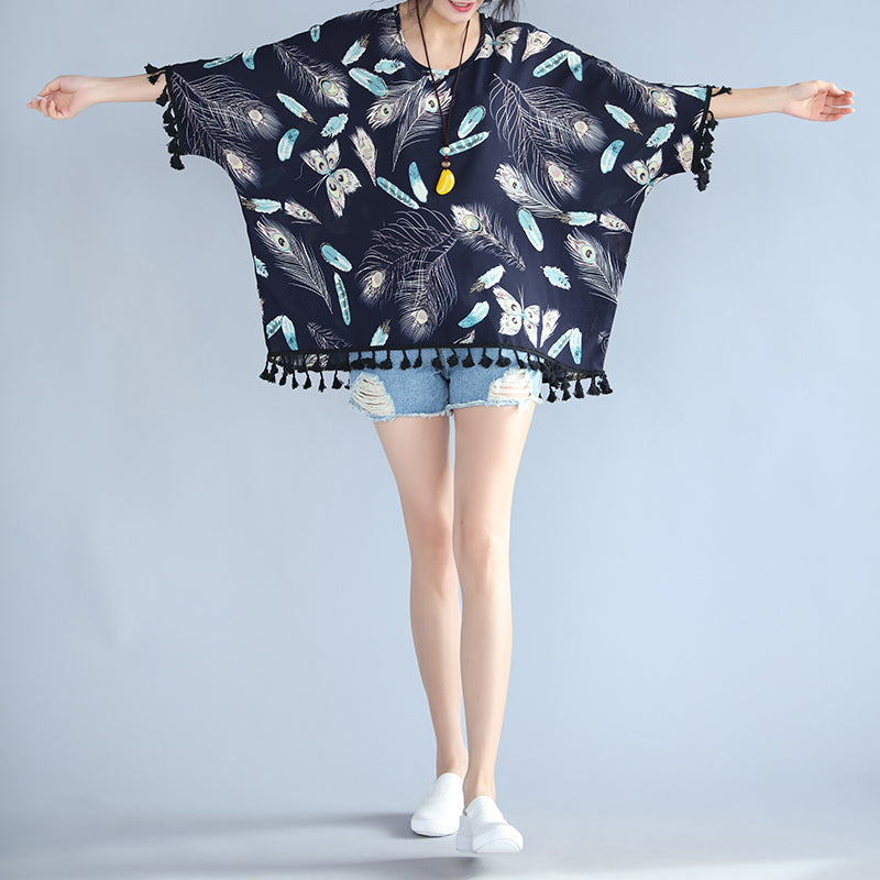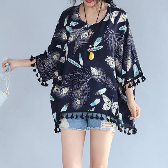 feines marineblaues T-Shirt aus natürlichem Leinen, locker sitzende, lässige Strickjacken, Boutique-Oberteile aus Leinen und Baumwolle mit Quasten und Blumenmuster