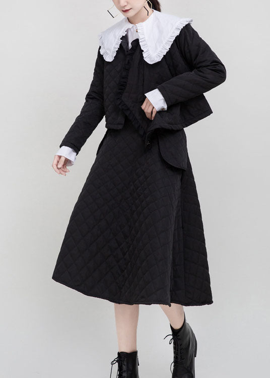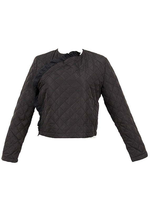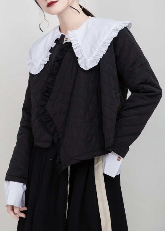 Einzigartiger schwarzer Knopf Patchwork Rüschen Wintermantel Langarm
