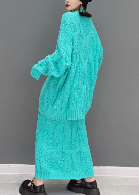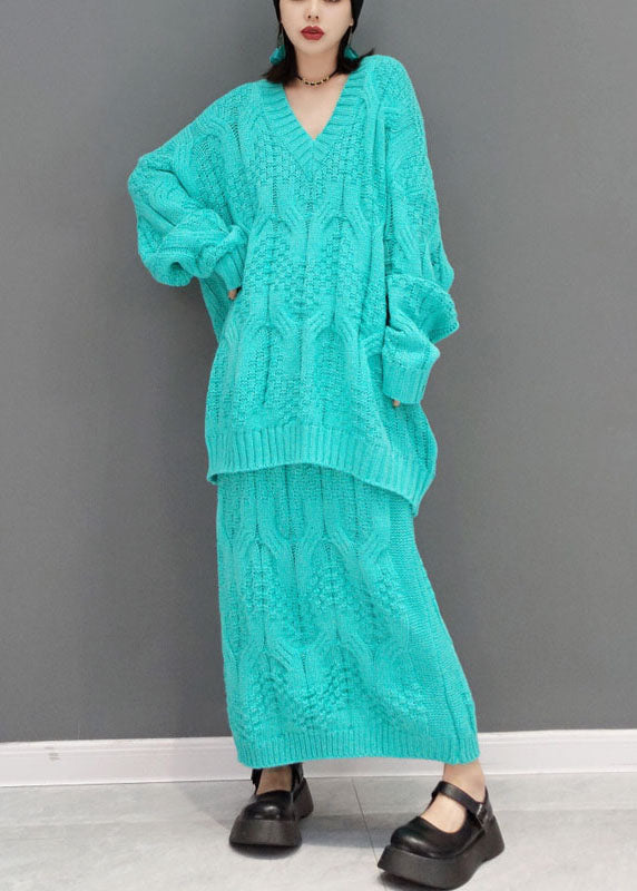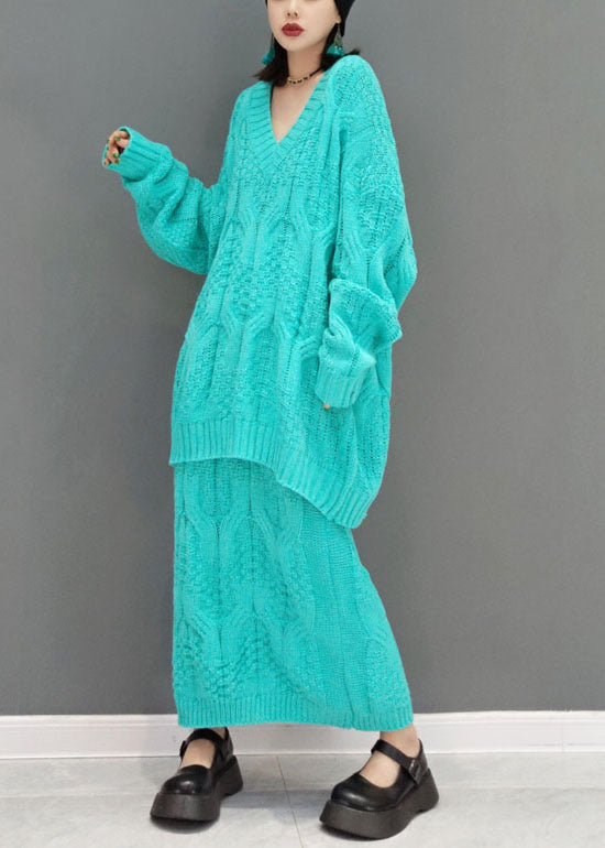 Einzigartige blaue V-Ausschnitt Zopfmuster Tops A-Linie Röcke Zweiteiliges Set Frühling