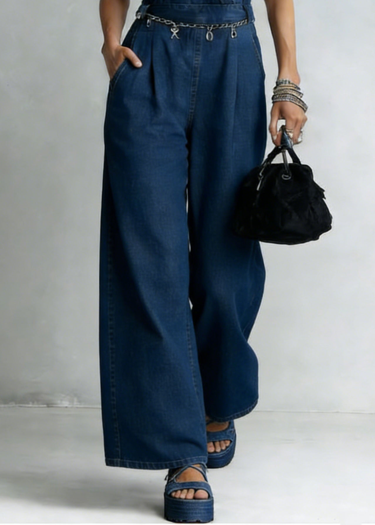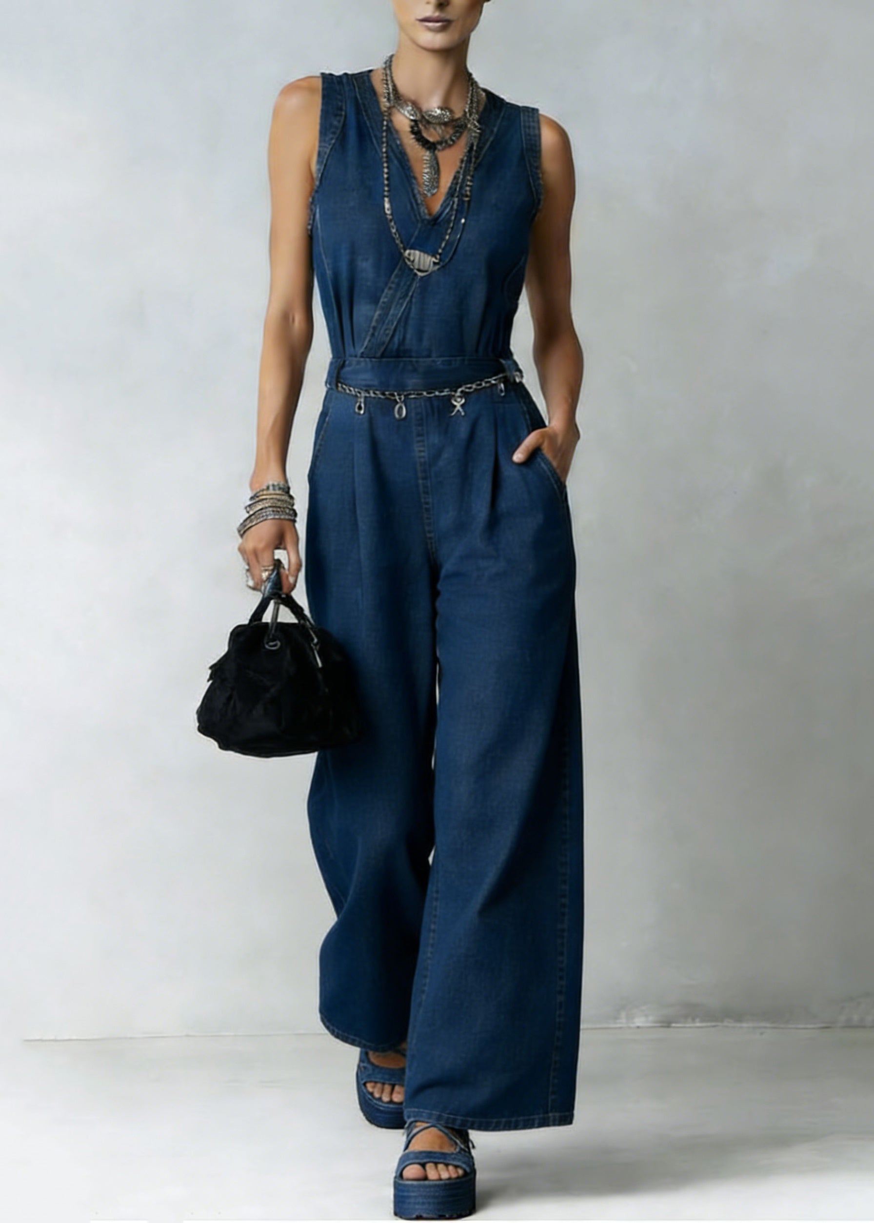 Unique Blue V Neck High Waist Denim Jumpsuit Sleeveless