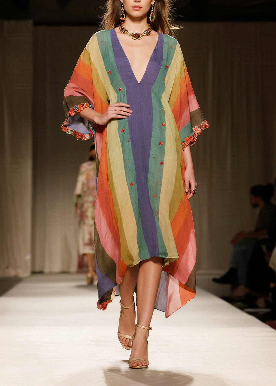 Unique Multicolored Ruffled Striped Cotton Maxi Dress Bracelet Sleeve