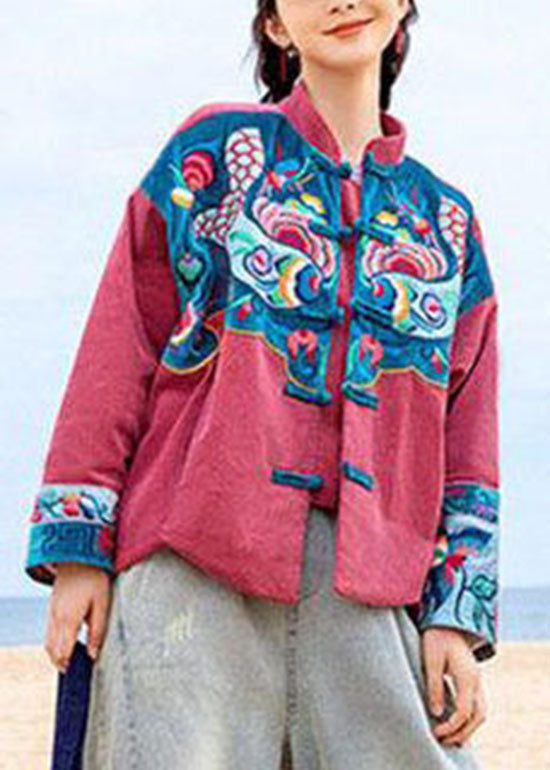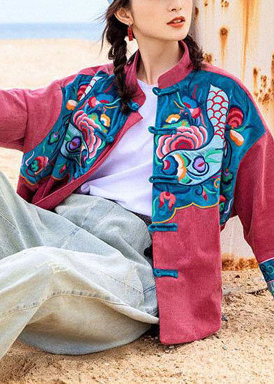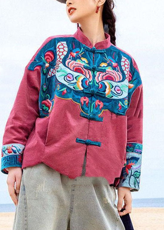 Einzigartiger roter Knopf Stehkragen bestickter Cordmantel Frühling