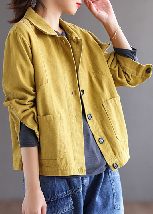 Einzigartiger gelber PeterPan-Kragen, Knopftaschen und Patchwork-Herbstmantel
