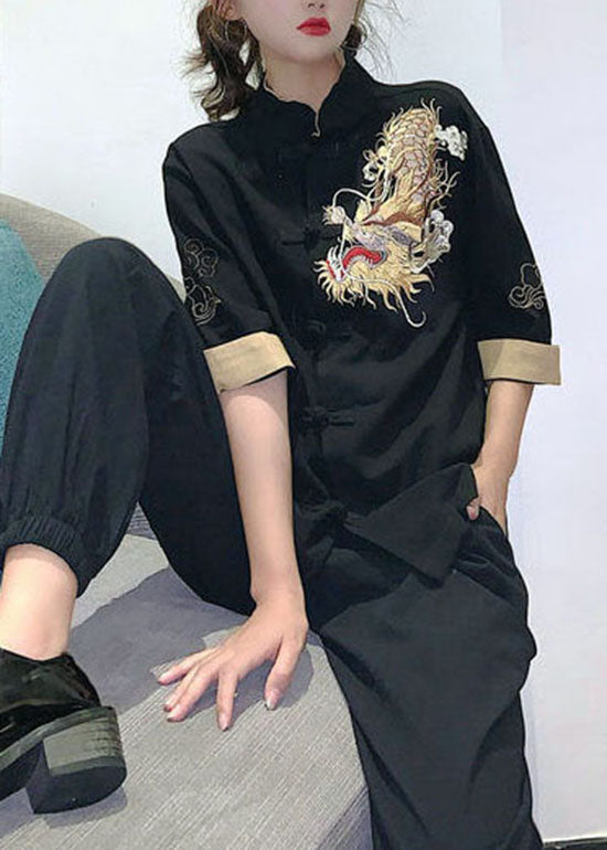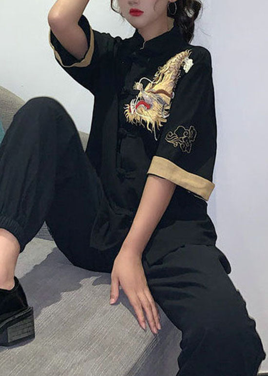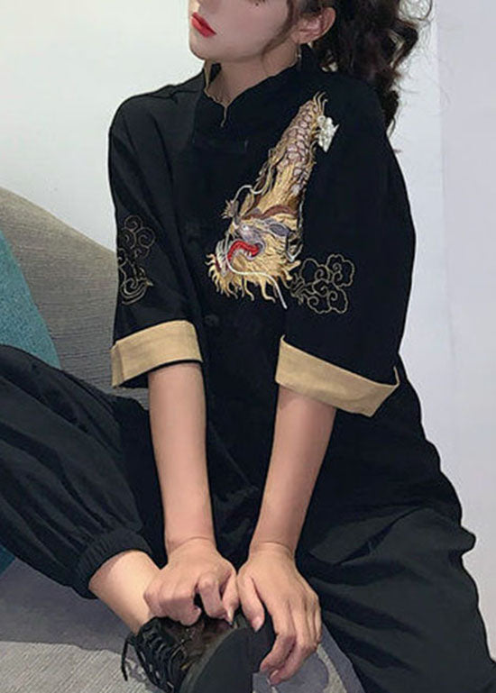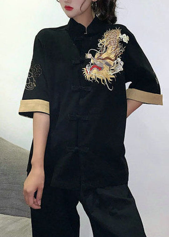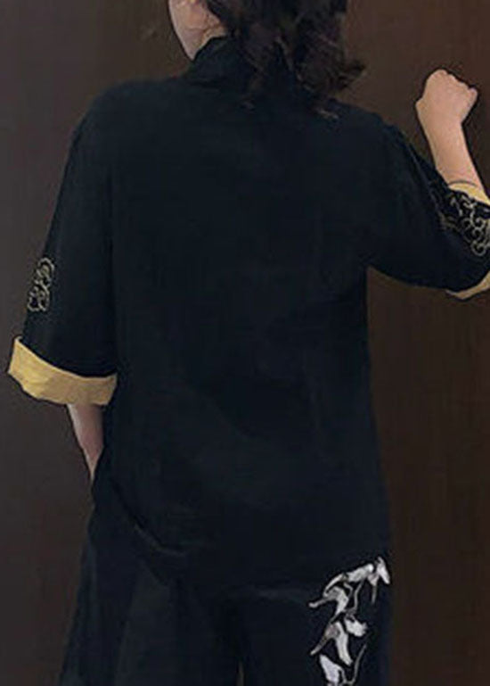 Vintage Schwarzer Knopf Stehkragen Bestickte Baumwolloberteile Halbarm