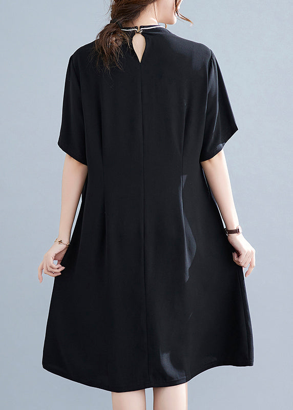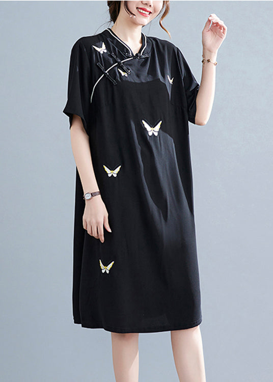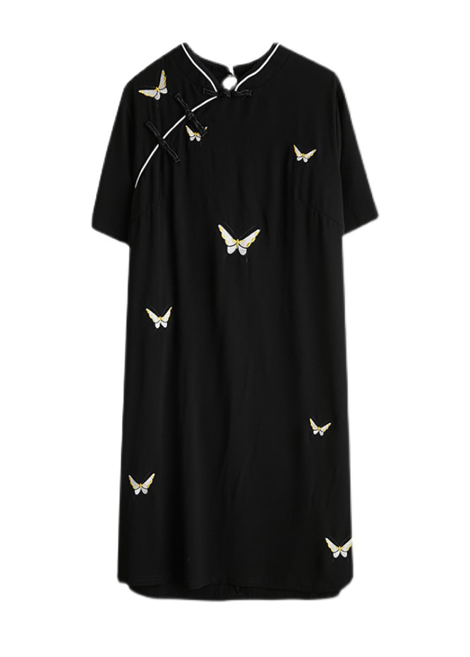 Vintage Schwarz Stehkragen Knopf Schmetterling Bestickt Cheongsam Kleider Kurzarm