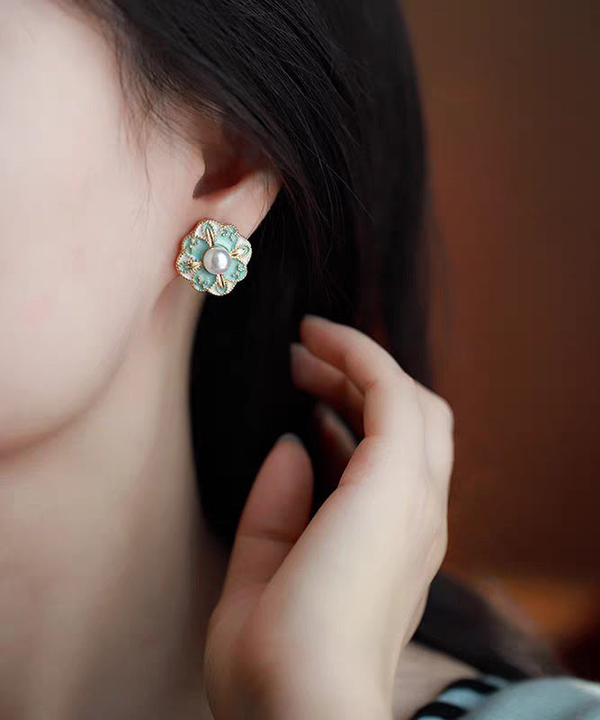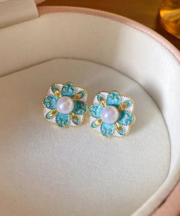 Vintage Blue Copper Pearl Floral Stud Earrings