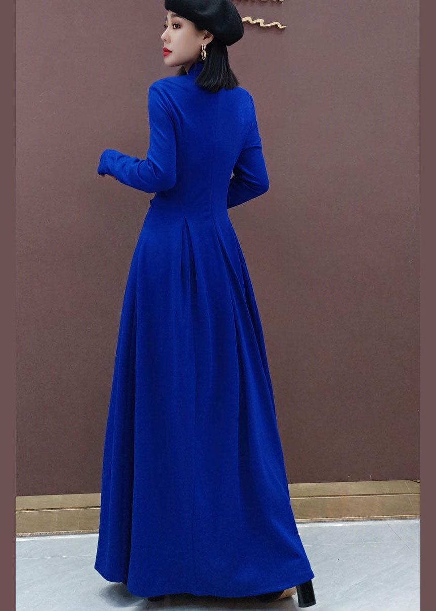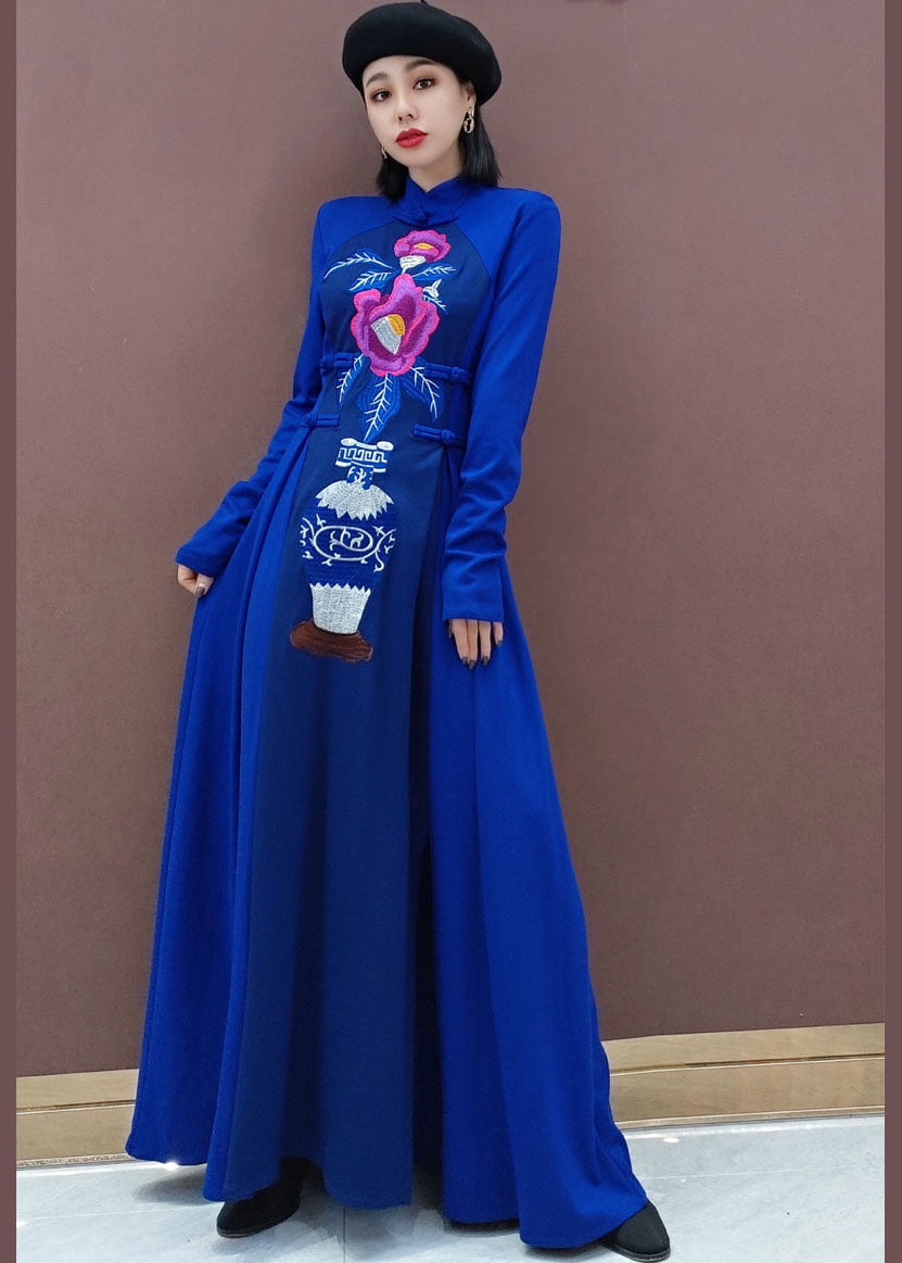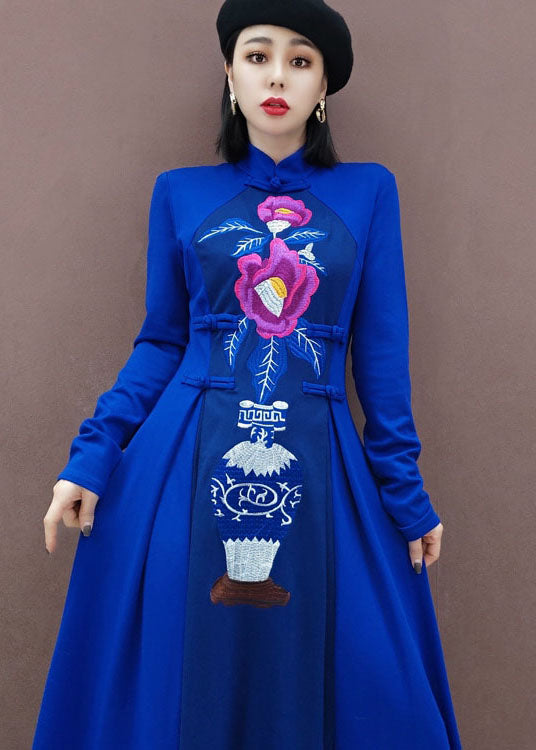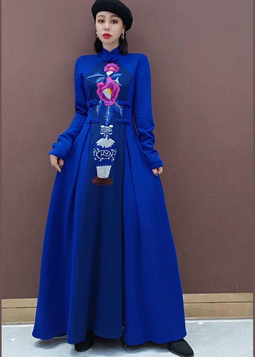 Vintage Blau Stehkragen Bestickt lange Kleider Frühling