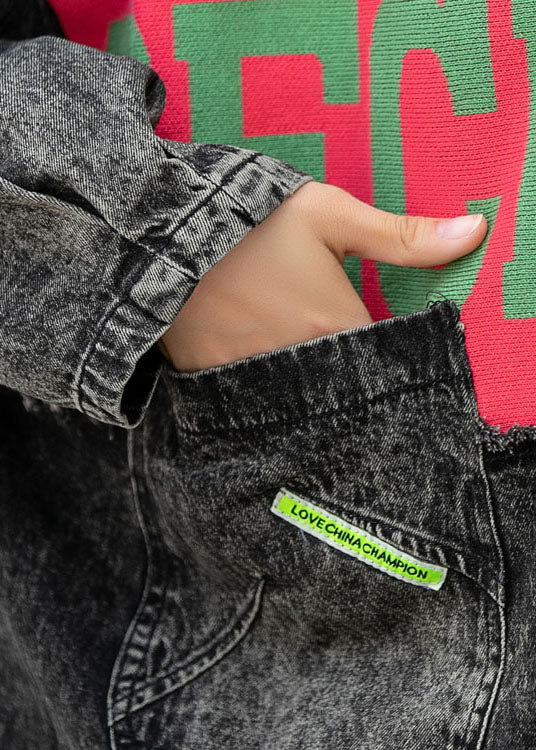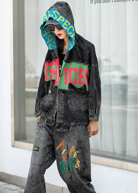 Vintage Denim Patchwork Stricktaschen Kapuze Herbst Mäntel Langarm