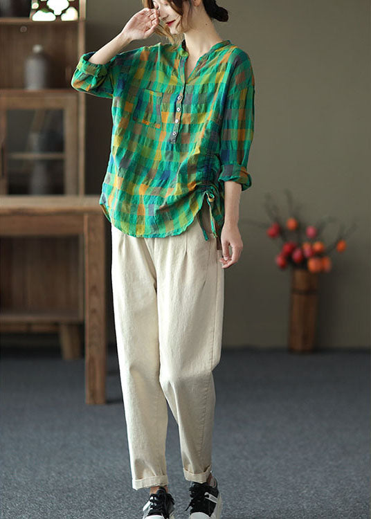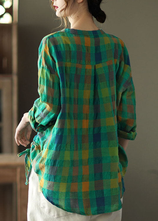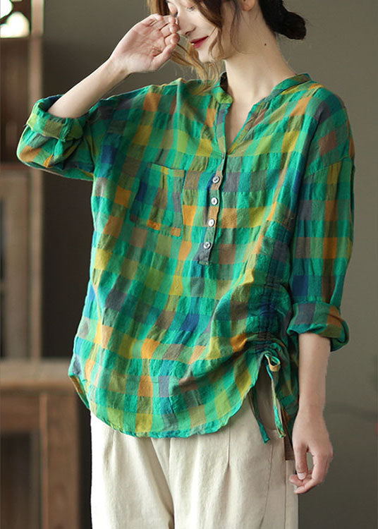 Vintage Grünes, lockeres, kariertes Langarmhemd mit Kordelzug für den Herbst