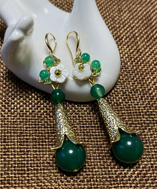 Vintage Green Sterling Silver Overgild Jade Agate Shell Flower Drop Earrings