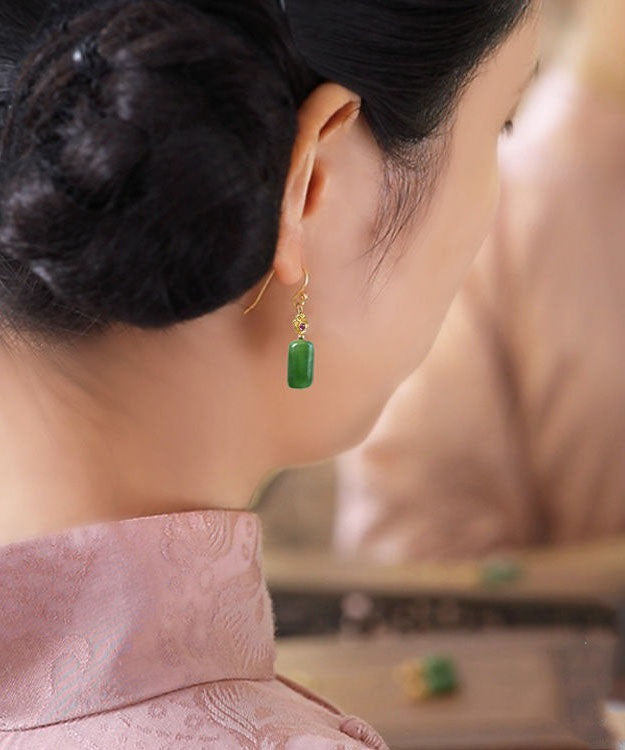 Vintage Green Sterling Silver Square Jade Drop Earrings