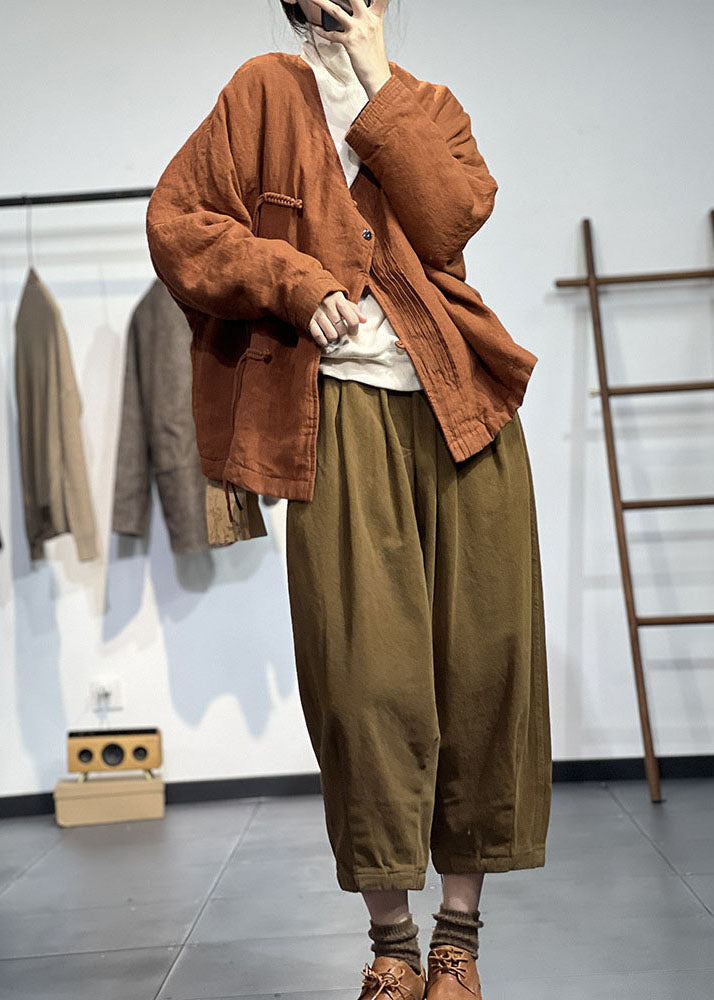 Vintage Orange V-Ausschnitt Solide Falten Feine Baumwolle Gefüllte Wintermäntel