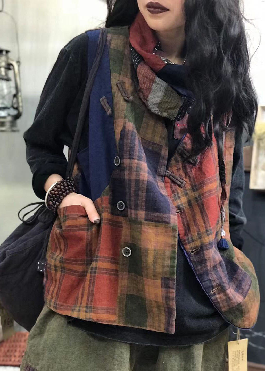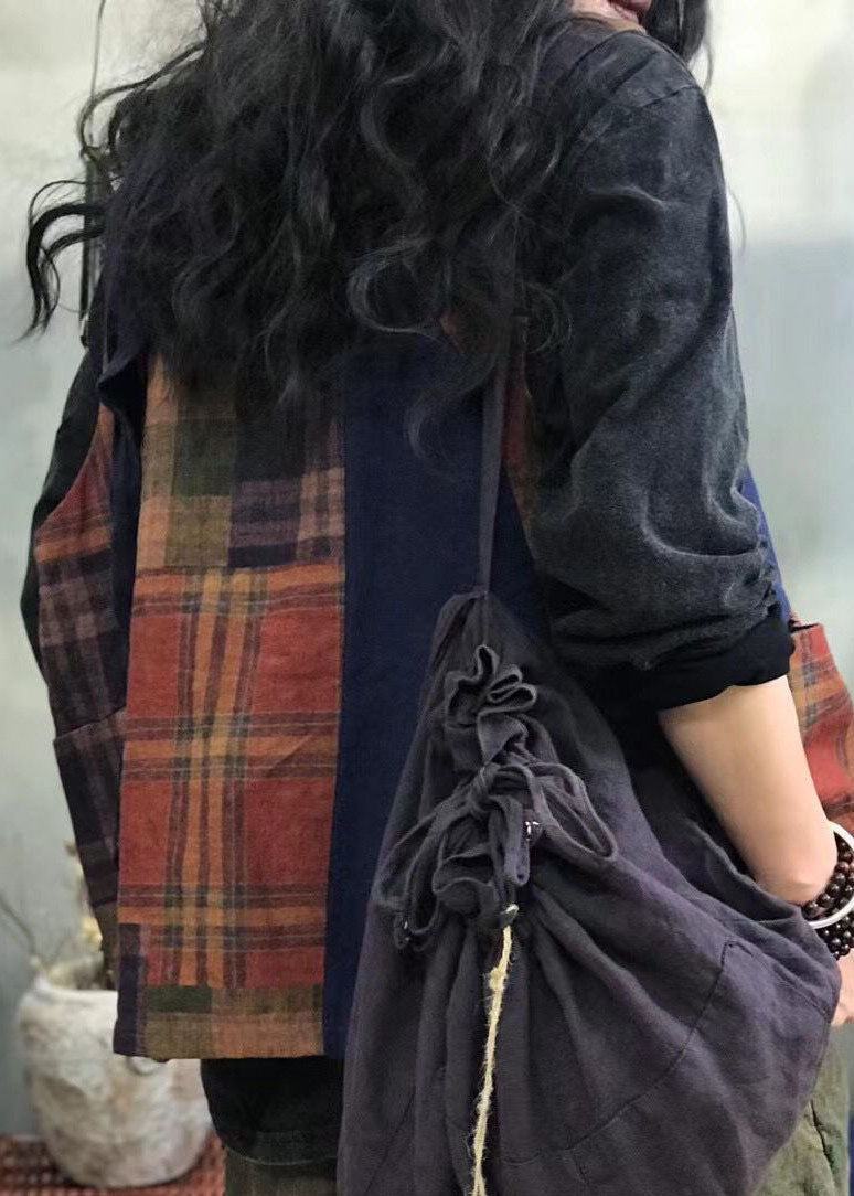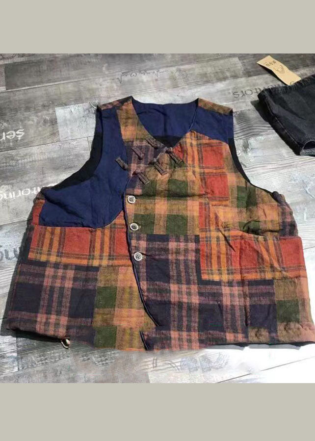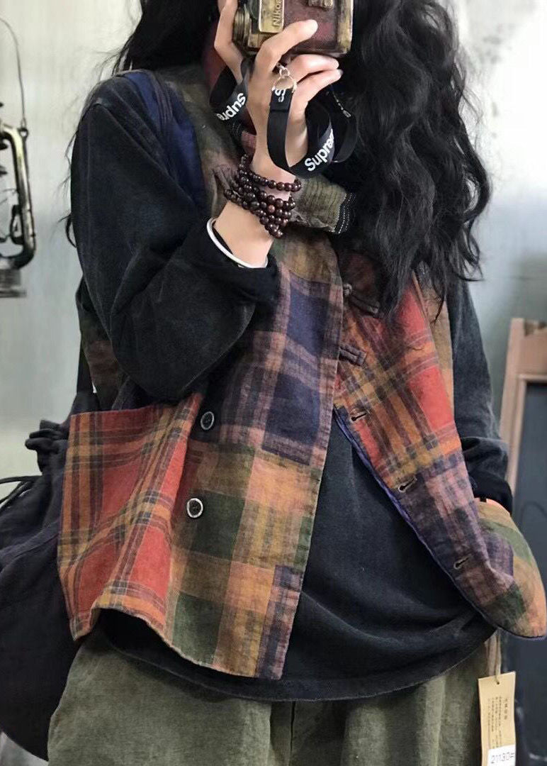 Vintage Roter Knopf Karo Patchwork Leinenweste Frühling