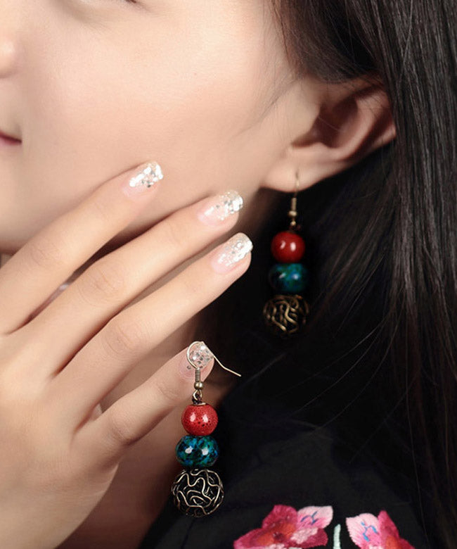 Vintage Red Sterling Silver Overgild Drop Jade Ceramics Earrings