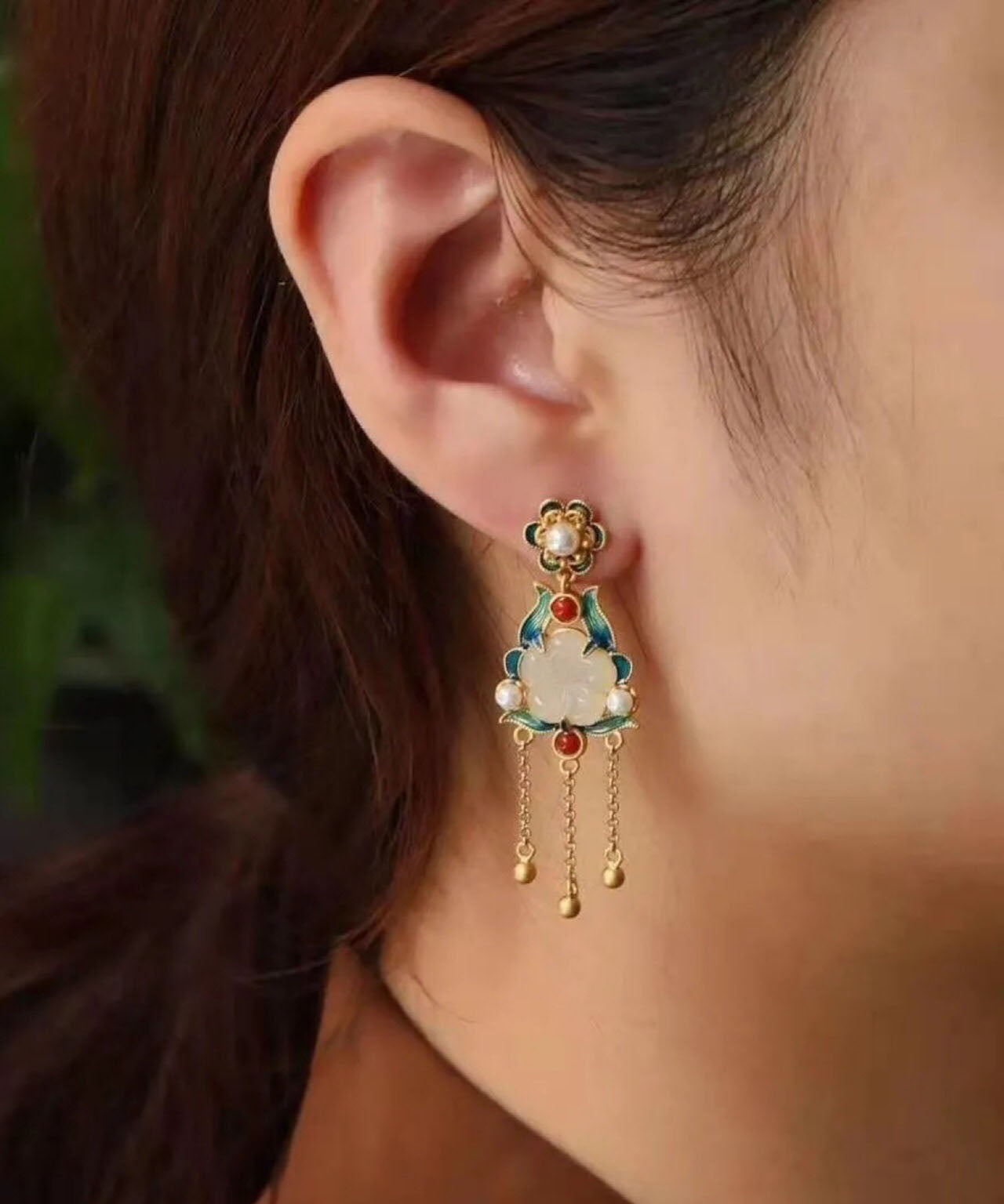 Vintage White Sterling Silver Overgild Inlaid Jade Agate Pearl Drop Earrings