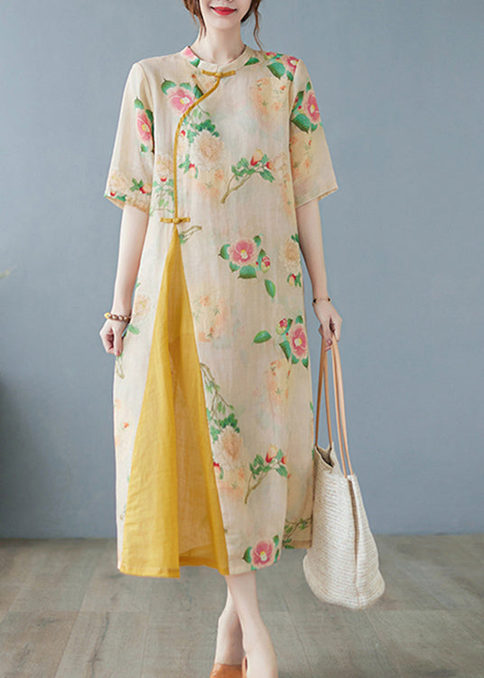 Vintage Gelb Print Patchwork Knopf Leinen Langes Kleid Halbarm