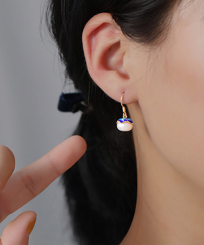 Vintage Yellow Sterling Silver Overgild Pearl Cloisonne Enamel Drop Earrings