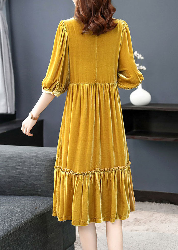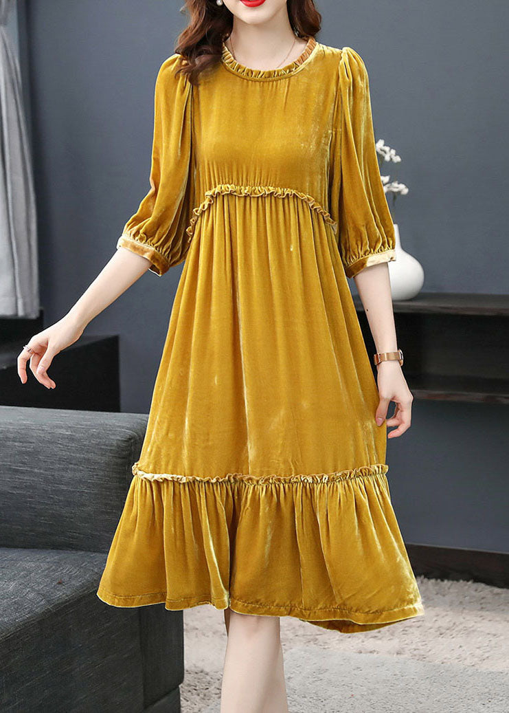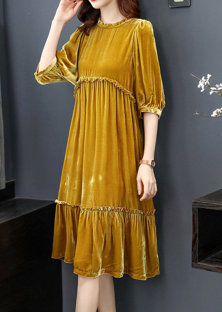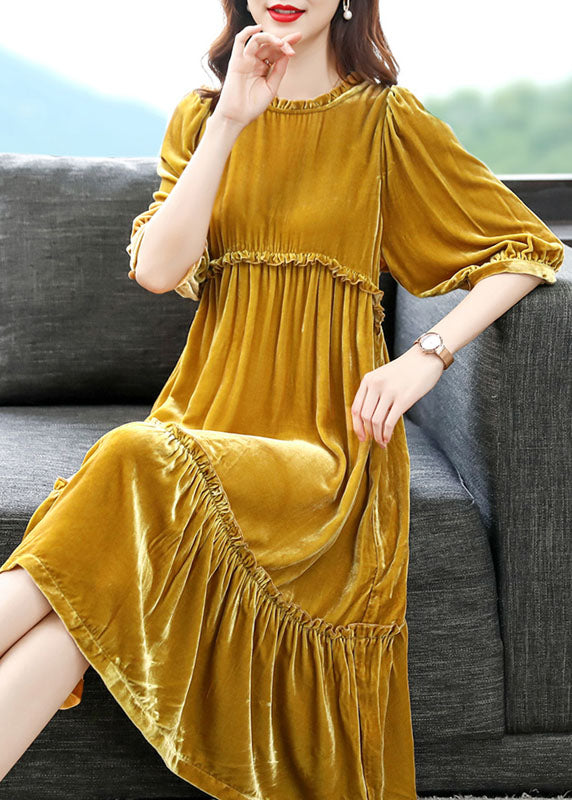 Vintage Gelbes, zerknittertes Velourskleid mit halben Ärmeln