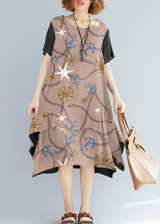 Vivid brown necklace linen-cotton tunics for women plus size Fabrics o neck asymmetric oversized Summer Dress