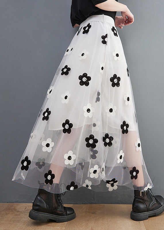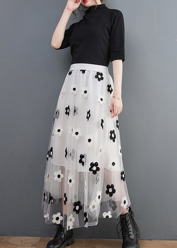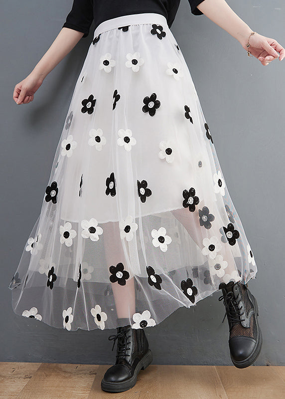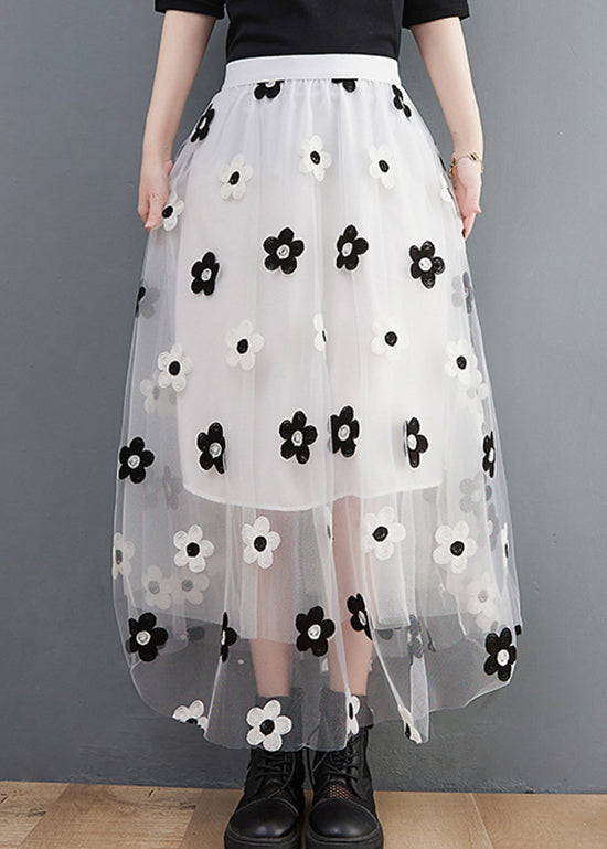 Weiße Blumen bestickte Tüllröcke mit hoher Taille Frühling