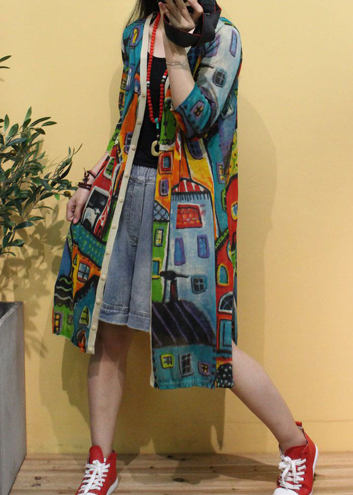 Frauen Beige V-Ausschnitt Print Seite offen Herbst Strick Langarm Strickjacken