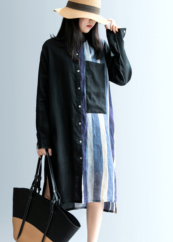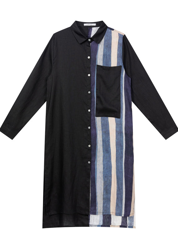 Frauen Schwarz low high design Gestreiften Leinen lange Hemd Frühling