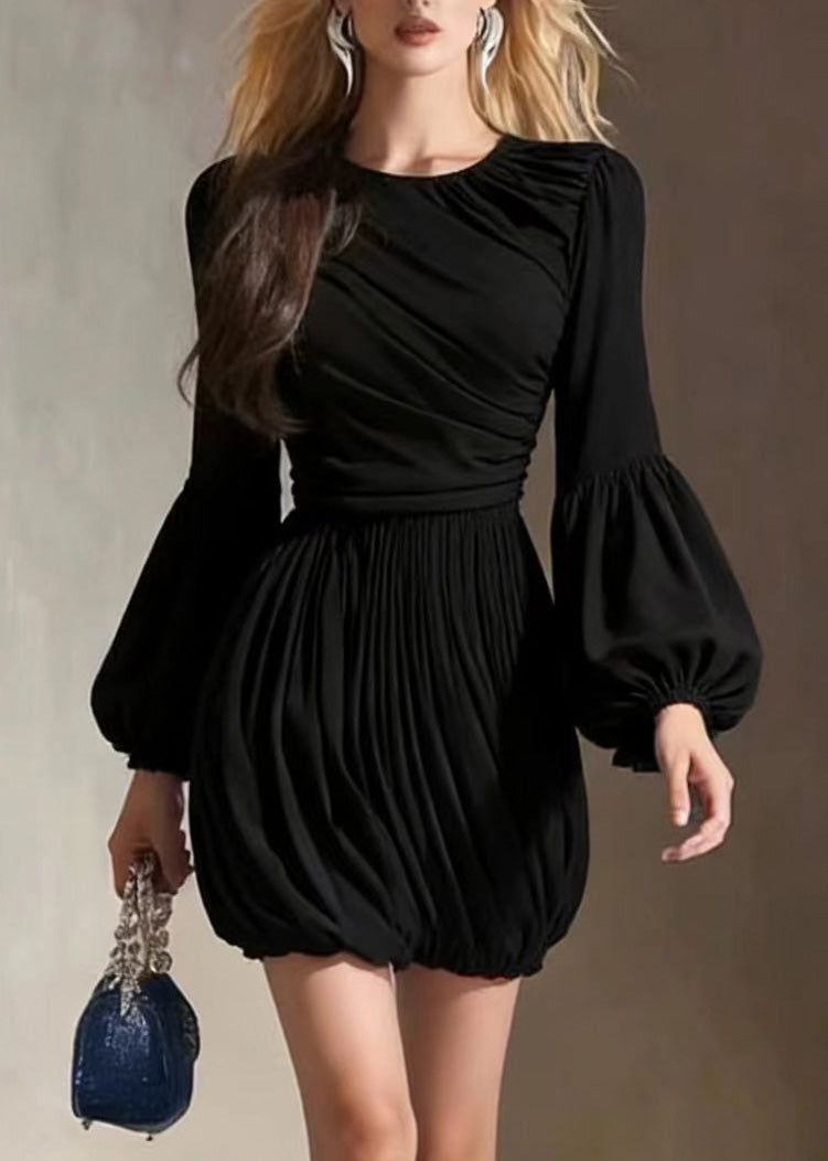 Women Black O Neck Wrinkled Patchwork Dress Lantern Sleeve