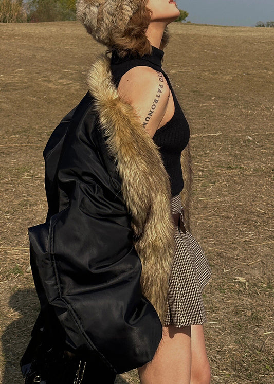 Women Black Oversized Patchwork Faux Fox Fur Coats Winter