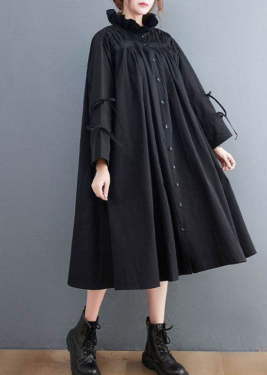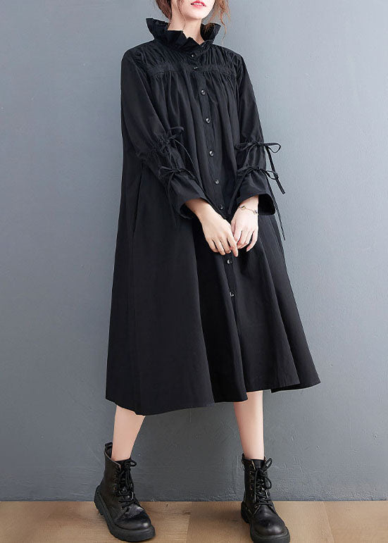 Frauen Schwarz Rüschen Taste Baumwolle Blusen Kleider Frühling