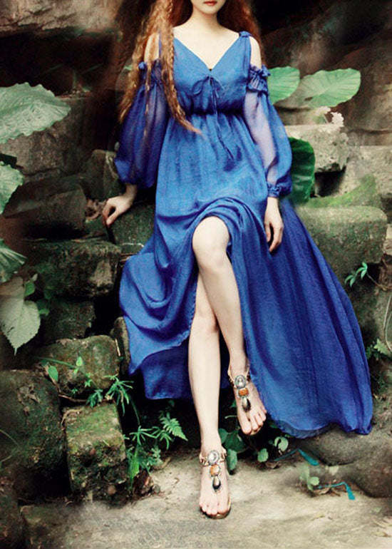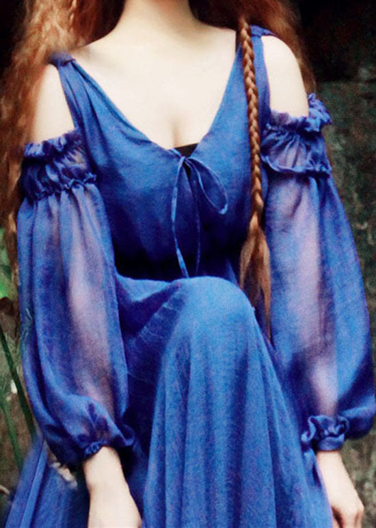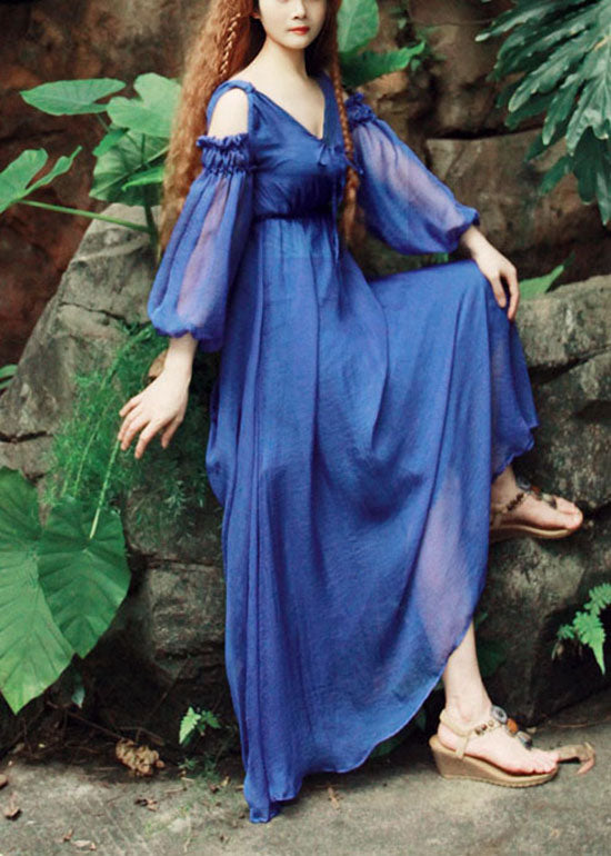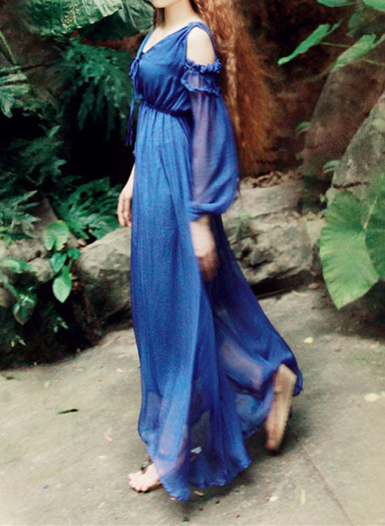 Frauen Blau V-Ausschnitt Cold Shoulder Seide Maxikleider Puffärmel