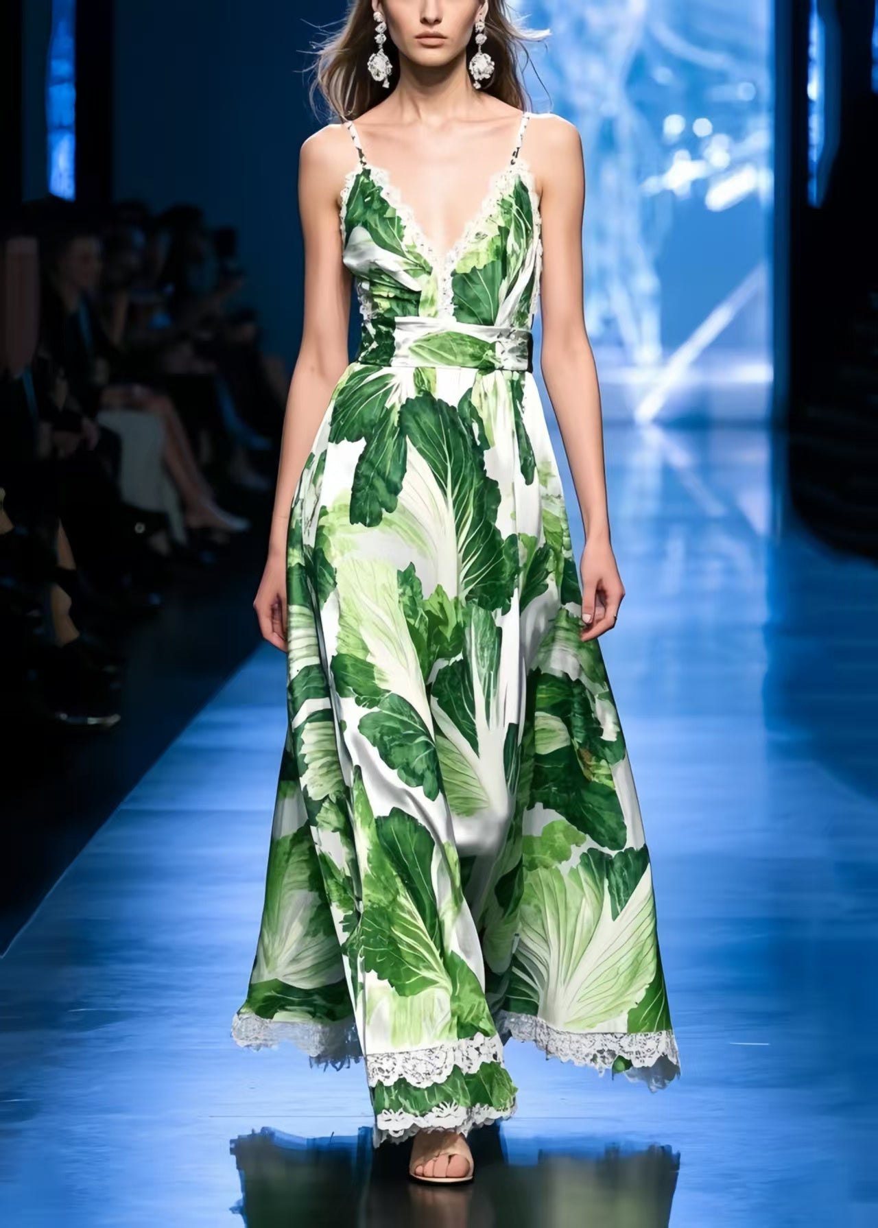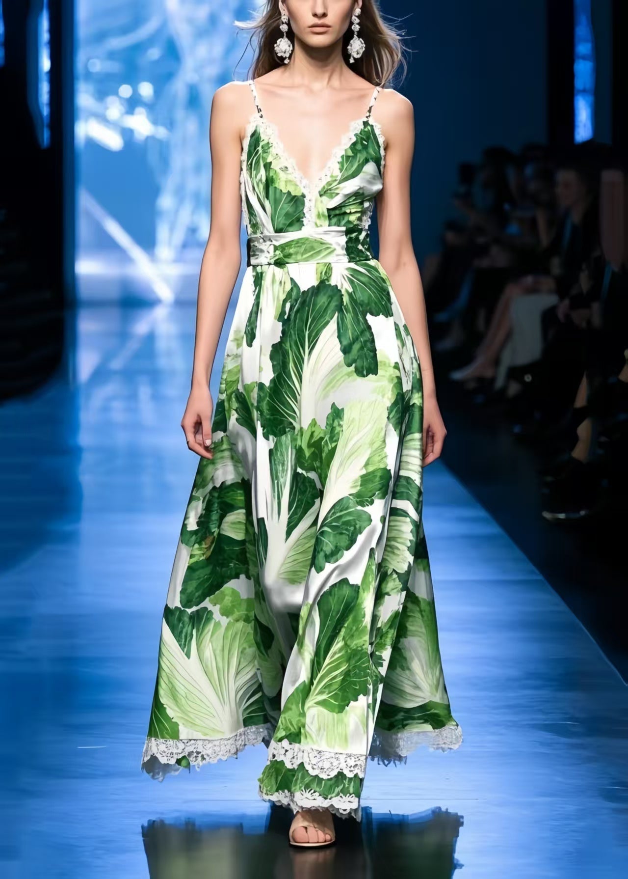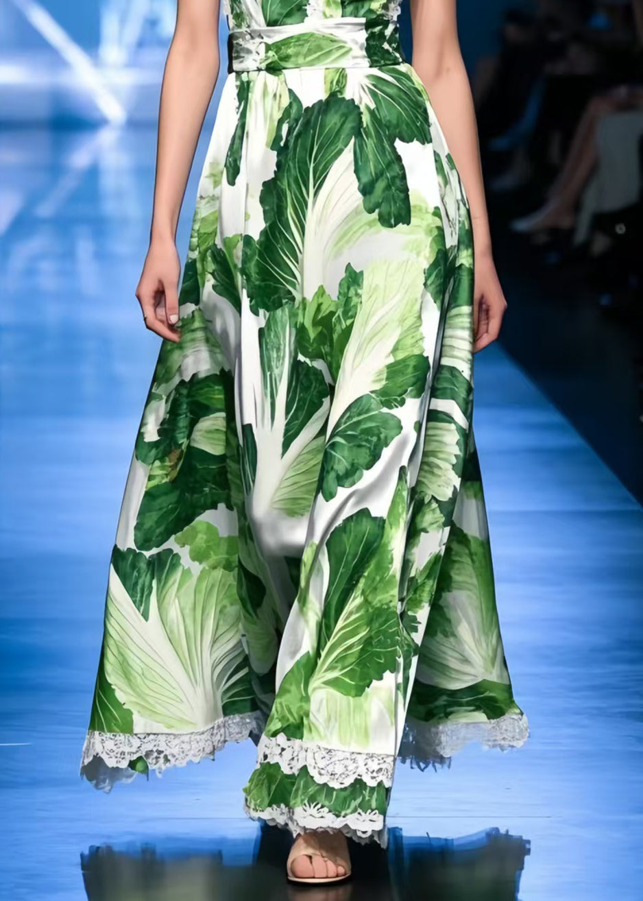 Women Chinese Cabbage Print Patchwork Lace Spaghetti Strap Dress Dress Summer